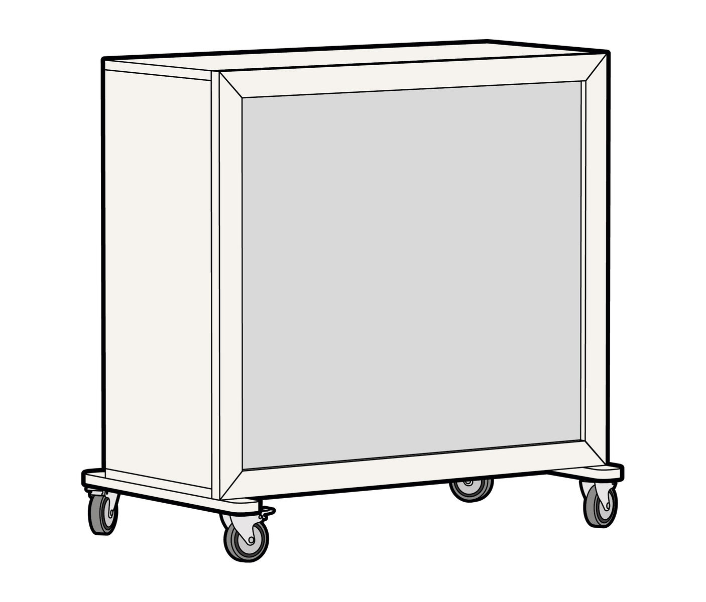 Ecophon Bulltin Board bagbeklædning i lysegrå. Træramme i samme farve som reol. Monteres på FIXA modul i tilsvarende størrelse.