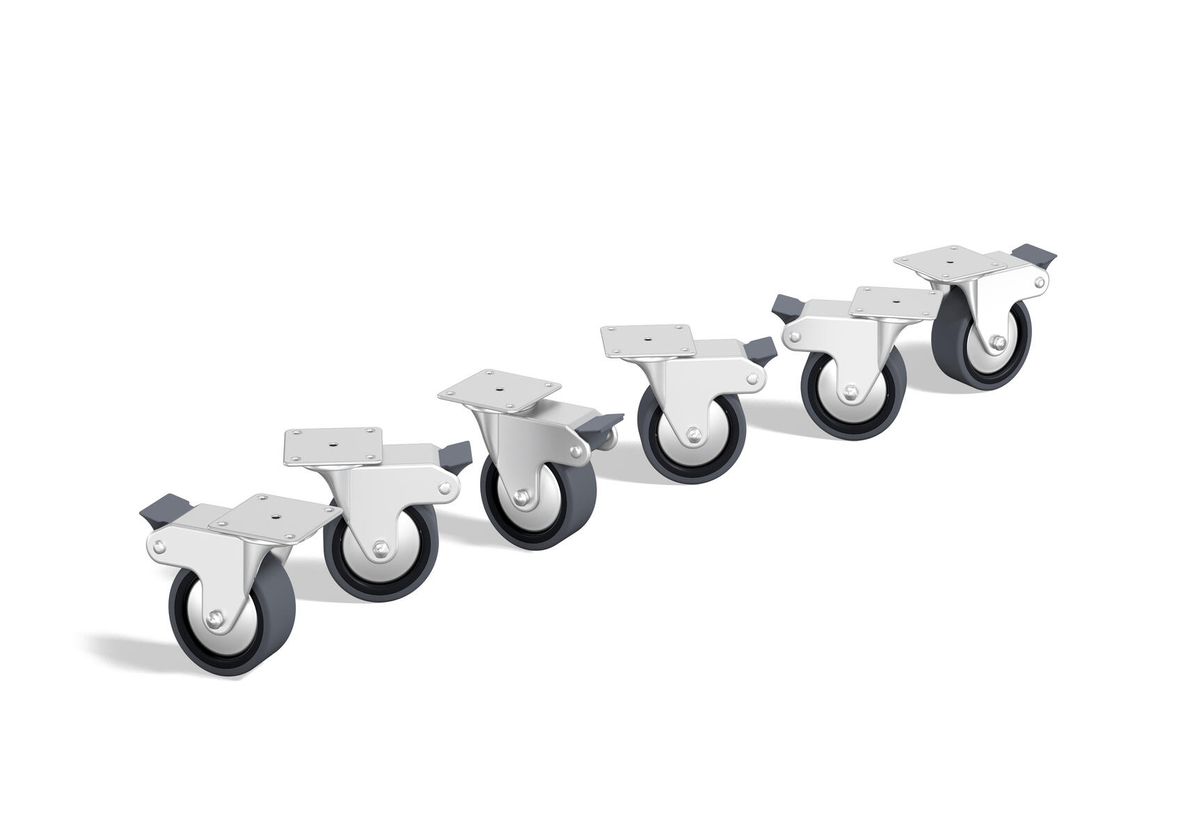 Hjulsæt til opbevaringsenheder. Bremse på de bevægelige hjul. Høje reoler har øget risiko for at vælte, især hvis de placeres frit i rummet. Hvis reolen skal placeres frit i rummet, skal man derfor bruge støtteben. Undgå at placere tunge genstande højt i reolen og lad ikke børn selv flytte den.