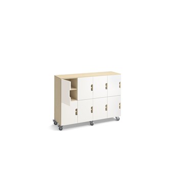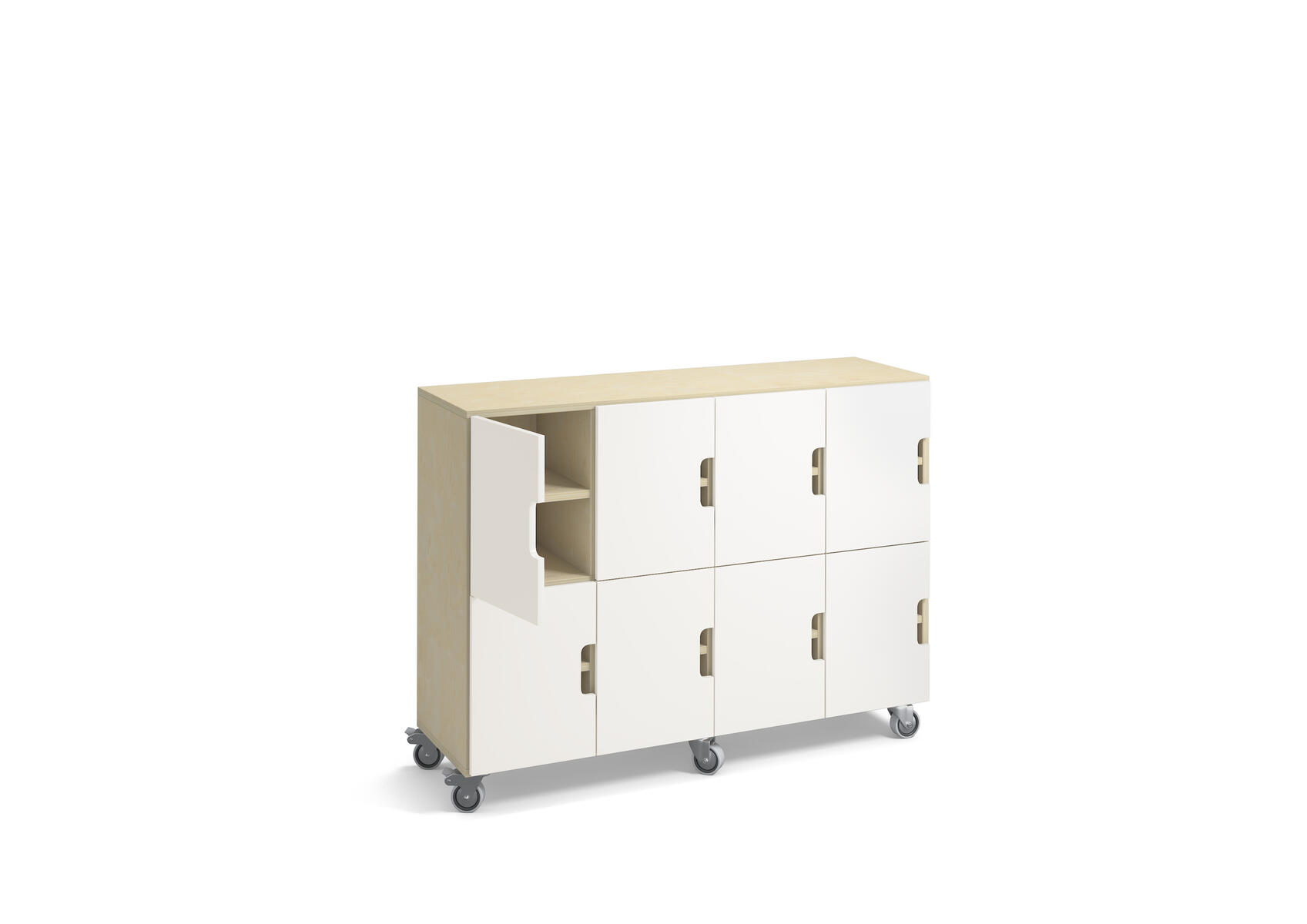 Færdigsamlet Fixa opbevaring med 8 rum. Skillevægge og hylder er faste. 4 hjul, hvoraf to er bevægelige med bremser, de to andre er faste, hvilket gør opbevaringen stabil ved flytning. Kræver enkel montering af hjul. Svanemærket, licensnummer 5031 0099.