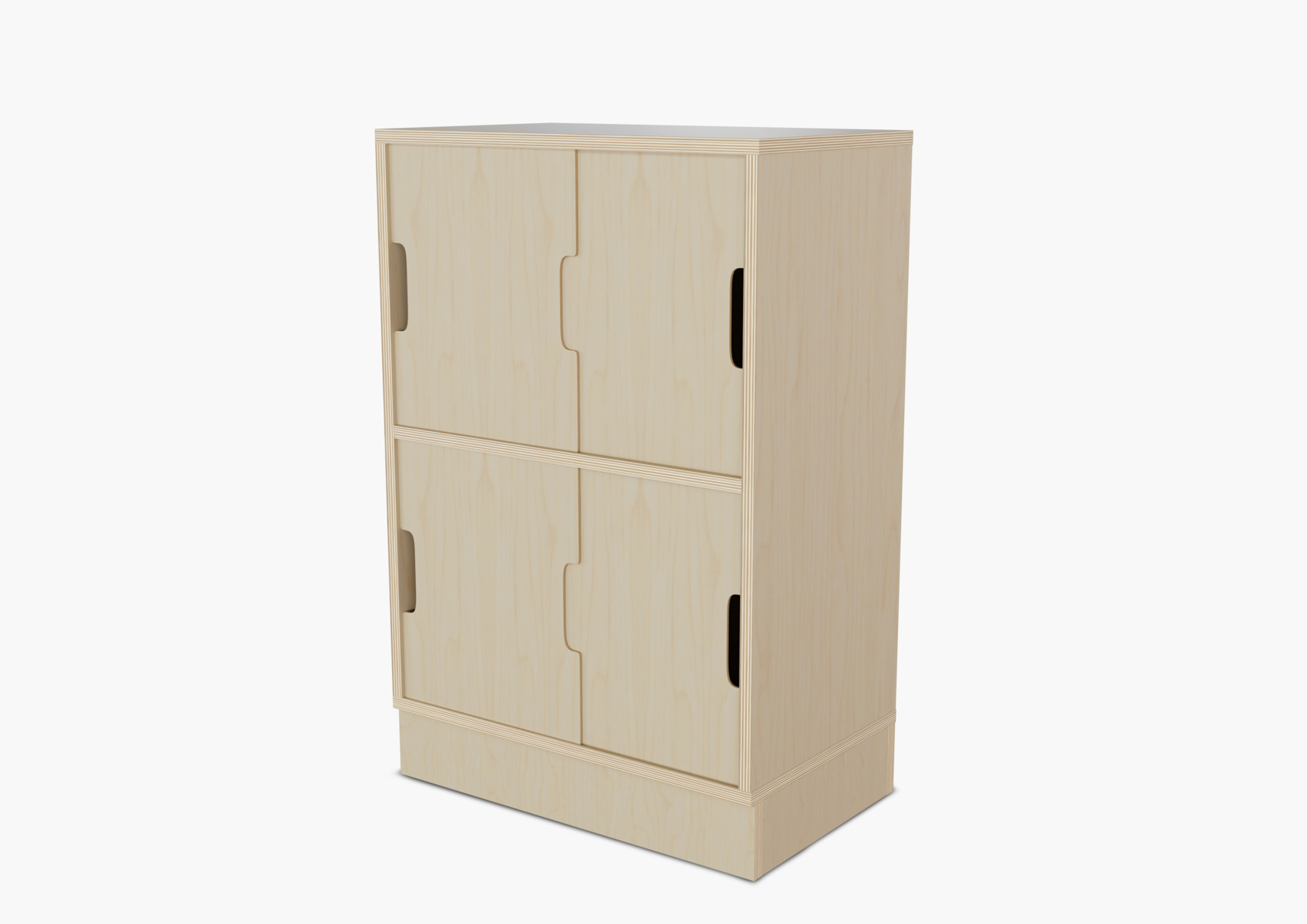 Komplet skabsmodul med valgfri ben, hjul eller sokkel. Ved valg af ben eller sokkel medfølger vinkelbeslag til vægmontering. Hjulene består af to faste og to bevægelige med lås. Korpus er fremstillet af 18 mm krydsfiner. Skydedøre med håndhul i 4 mm birkefiner.