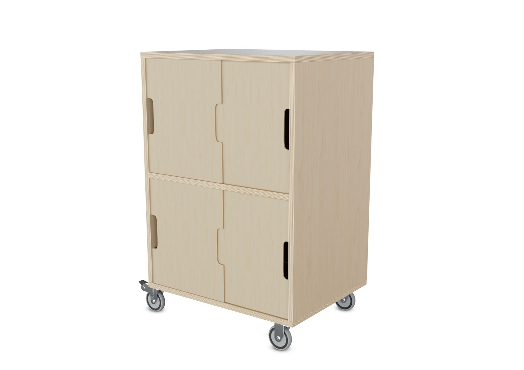Komplet skabsmodul med valgfri ben, hjul eller sokkel. Ved valg af ben eller sokkel medfølger vinkelbeslag til vægmontering. Hjulene består af to faste og to bevægelige med lås. Korpus er fremstillet af 18 mm krydsfiner. Skydedøre med håndhul i 4 mm birkefiner.