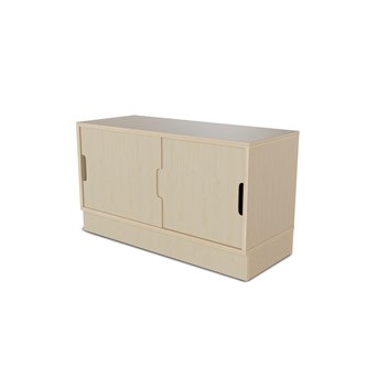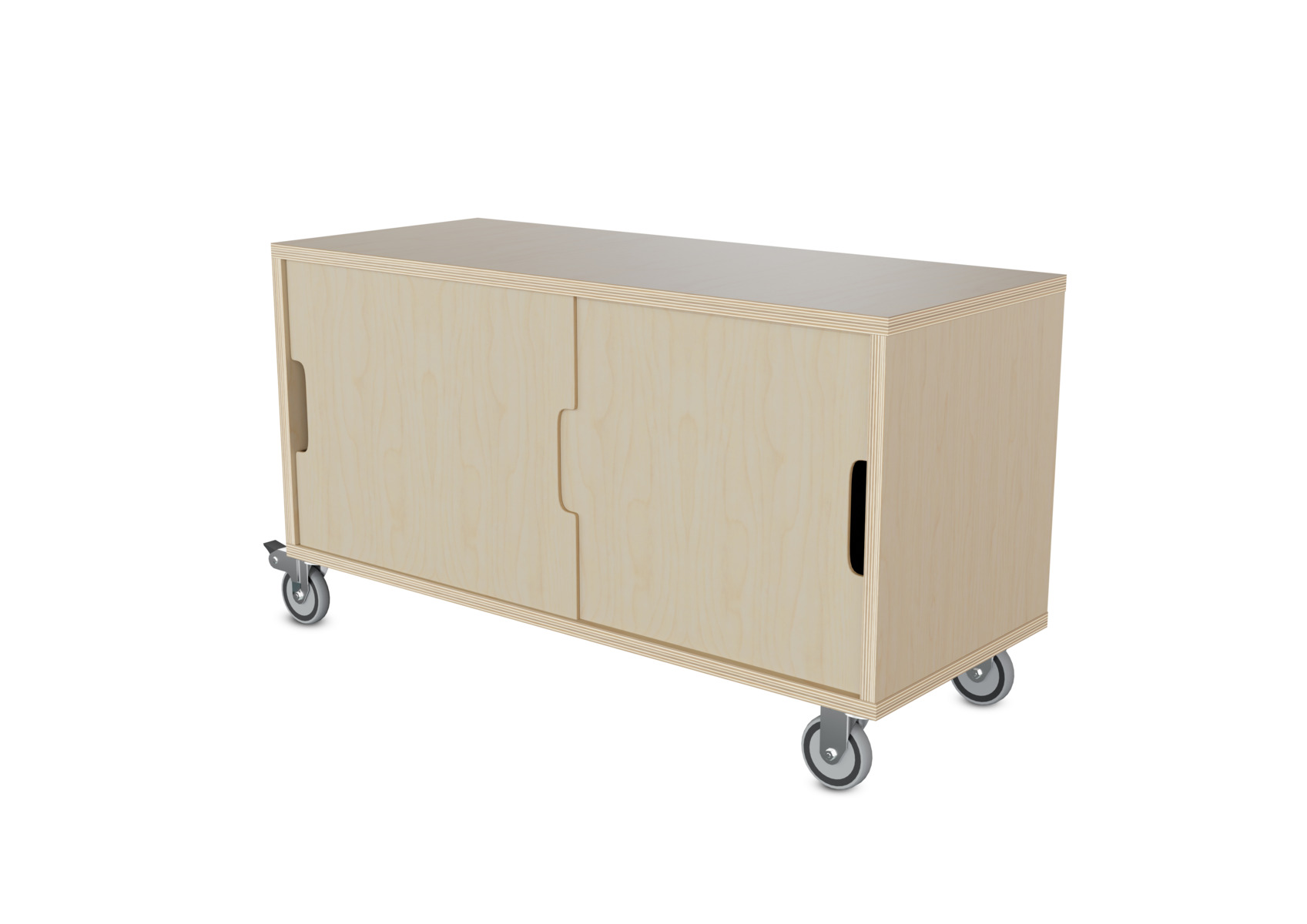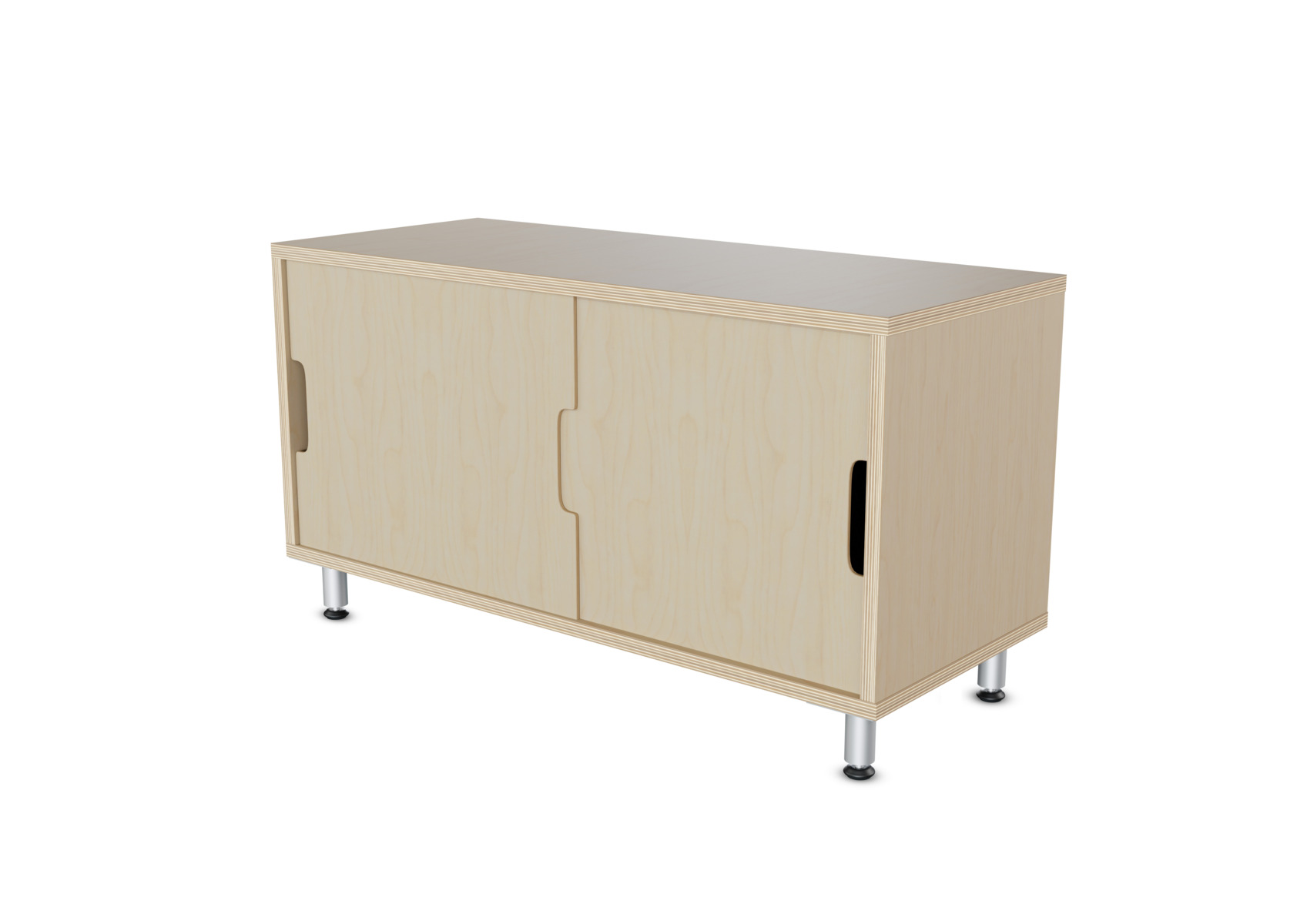 Komplet skabsmodul med valgfri ben, hjul eller sokkel. Ved valg af ben eller sokkel medfølger vinkelbeslag til vægmontering. Hjulene består af to faste og to bevægelige med lås. Korpus er fremstillet af 18 mm krydsfiner. Skydedøre med håndhul i 4 mm birkefiner.