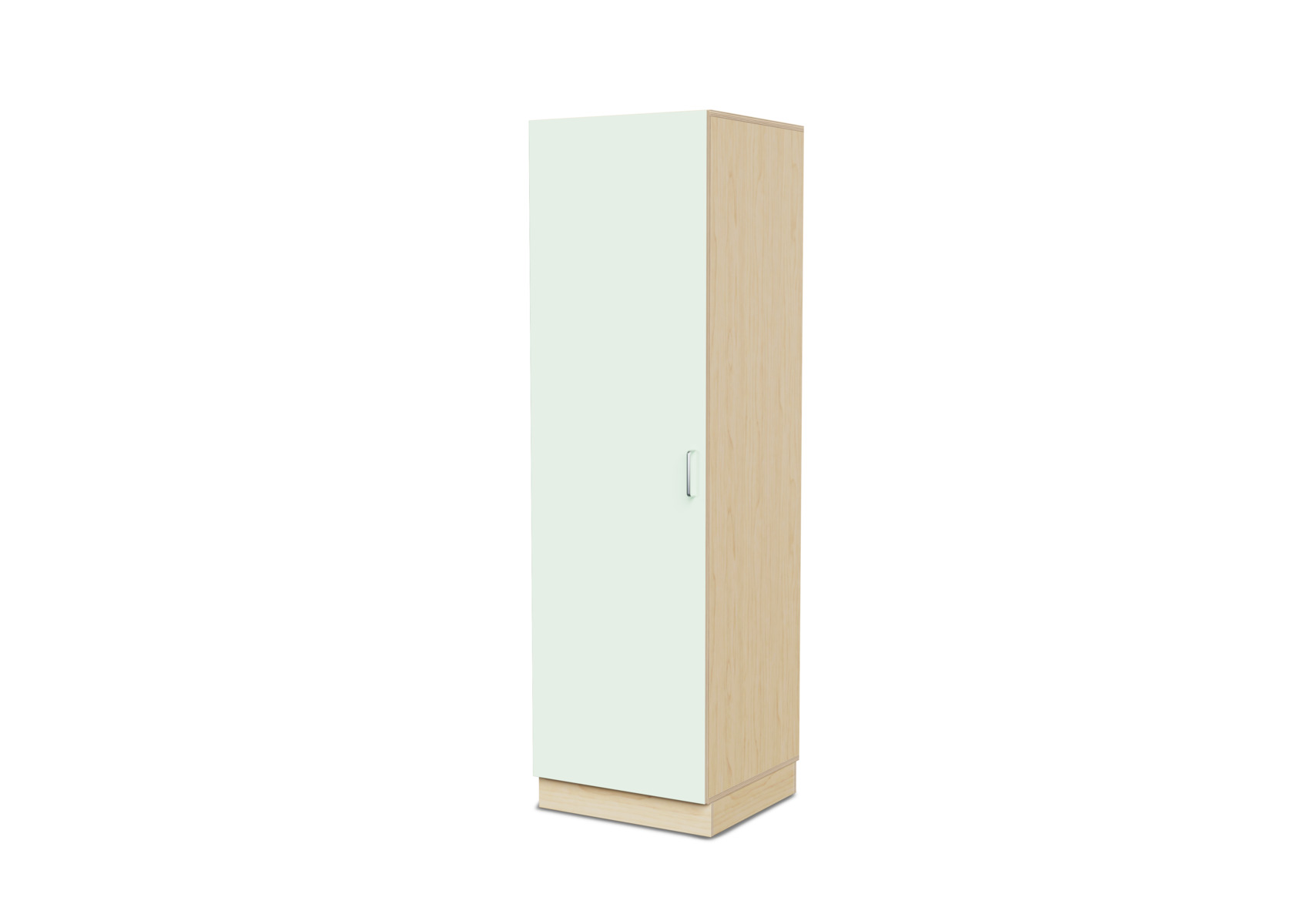 Komplet materialeskab med sokkel og fire hylder. Vinkelbeslag til vægforankring medfølger. Korpus af 18 mm krydsfinér. Dør i højtrykslaminat, hvidpigmenteret helt i krydsfinér.