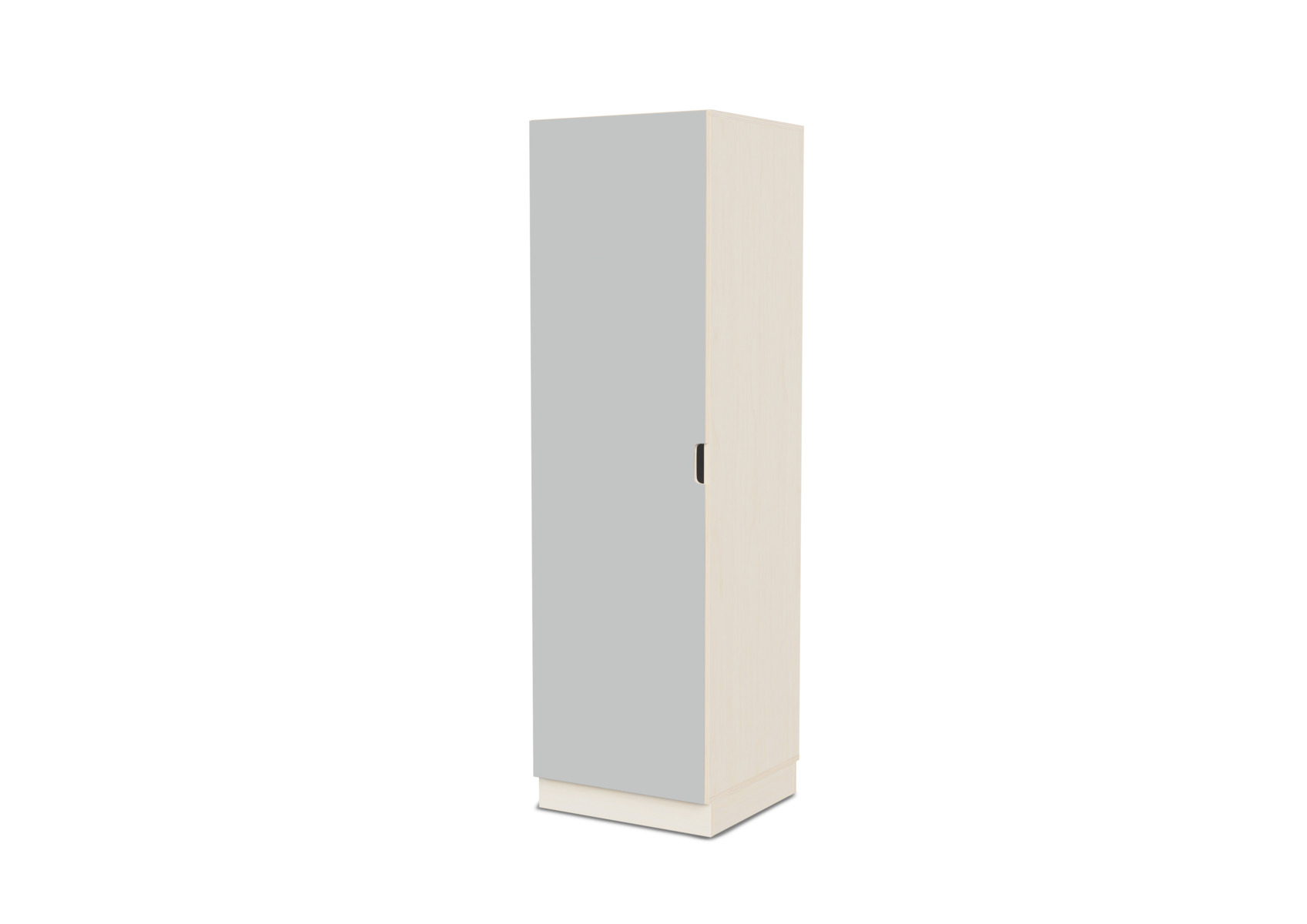 Komplet materialeskab med sokkel og fire hylder. Vinkelbeslag til vægforankring medfølger. Korpus af 18 mm krydsfinér. Dør i højtrykslaminat, hvidpigmenteret helt i krydsfinér.