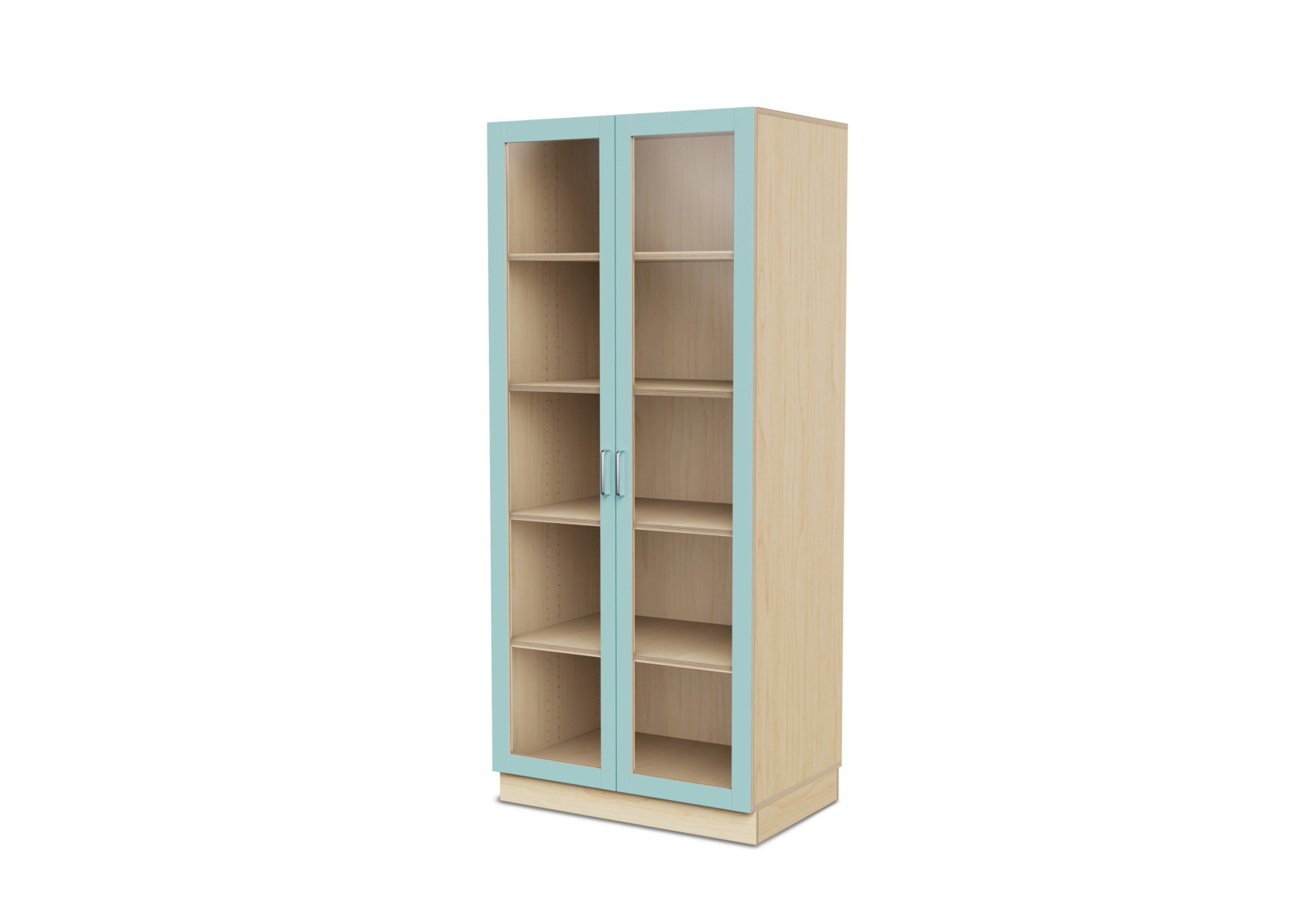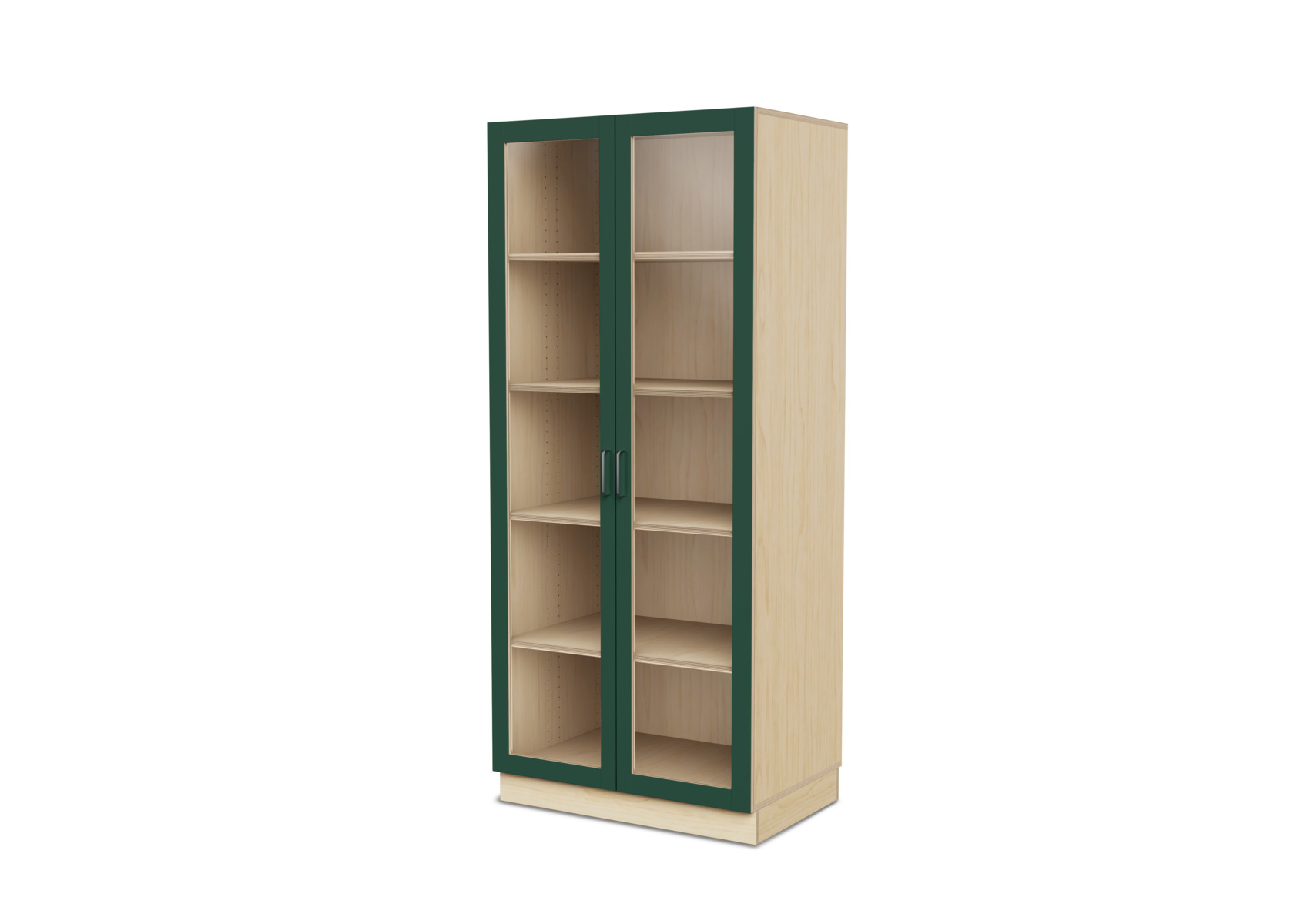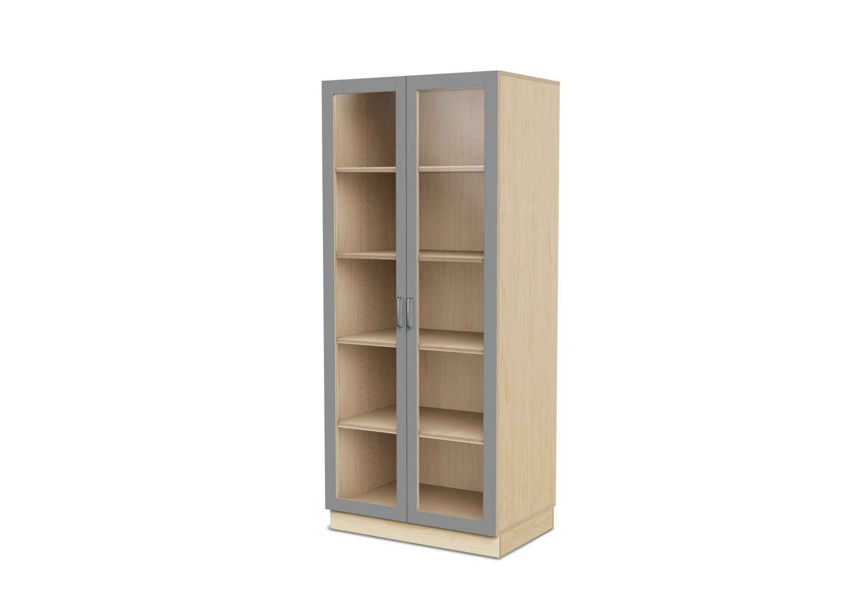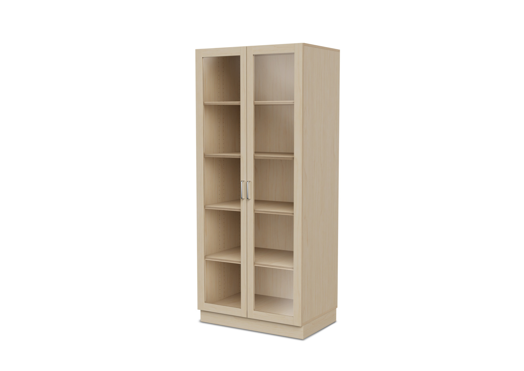 Komplet materialeskab med sokkel og fire hylder. Vinkelbeslag til vægforankring medfølger. Korpus af 18 mm krydsfinér. Dør i højtrykslaminat, birk helt i krydsfinér.