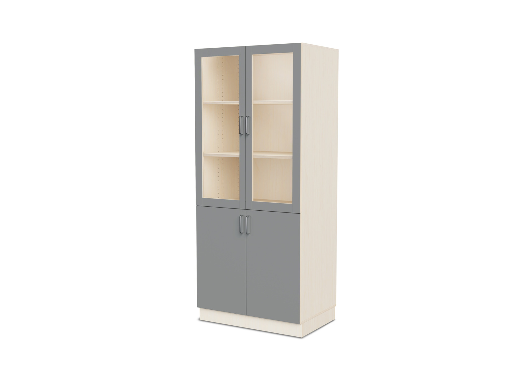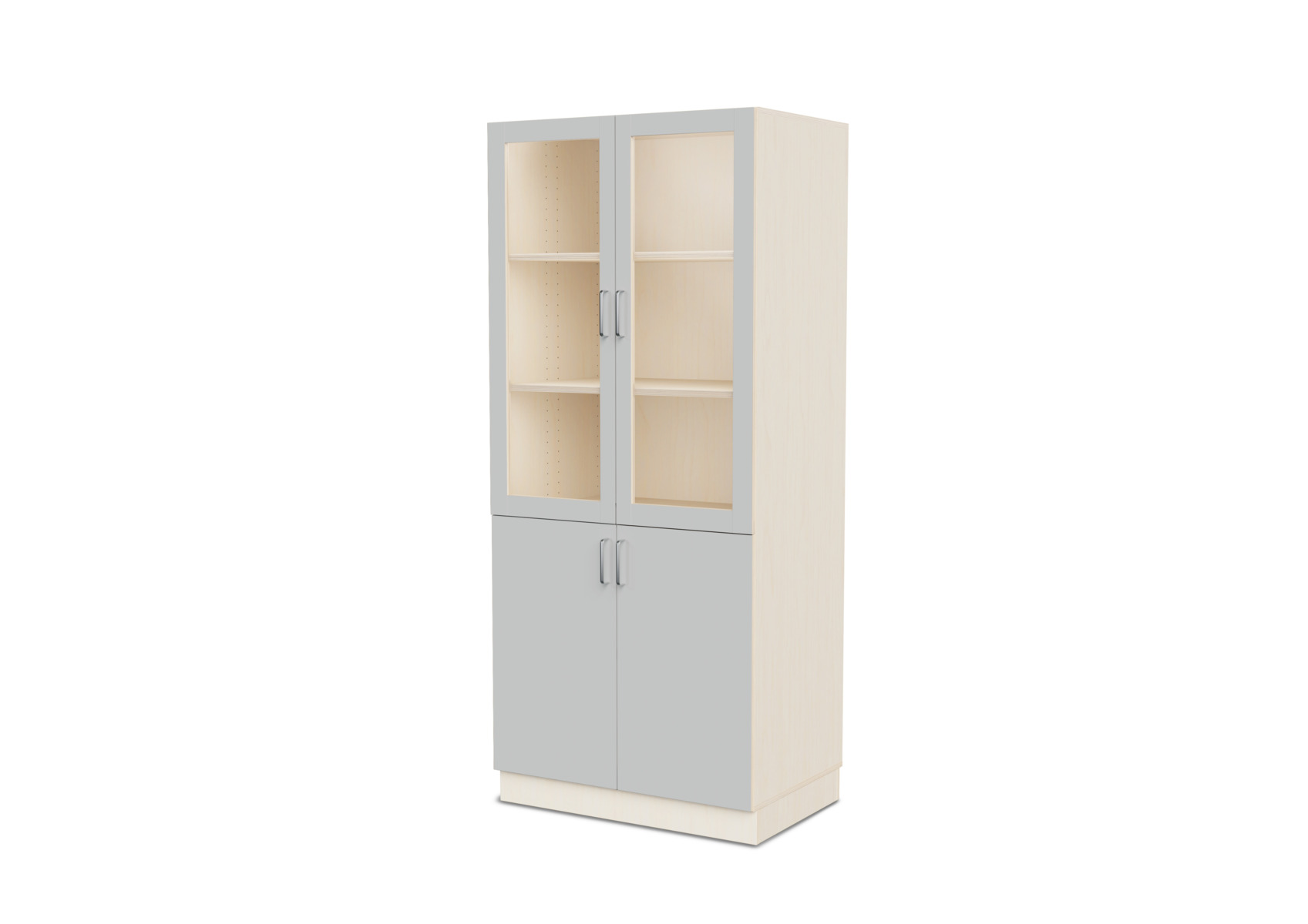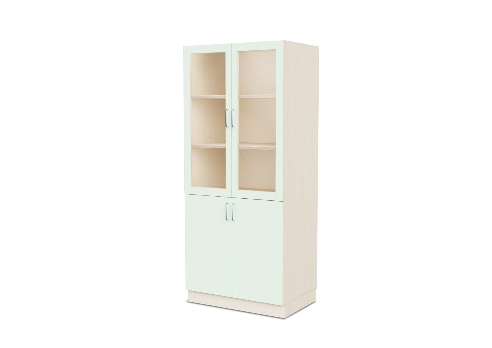Komplet materialeskab med sokkel og fire hylder. Vinkelbeslag til vægforankring medfølger. Korpus af 18 mm krydsfinér. Dør i højtrykslaminat, birk helt i krydsfinér.