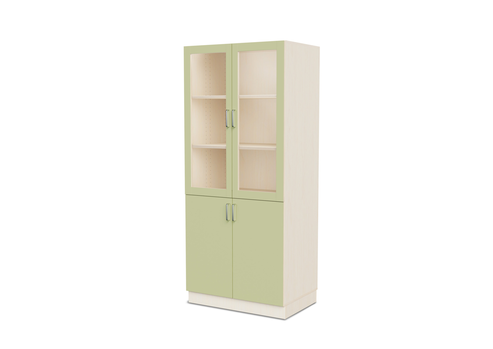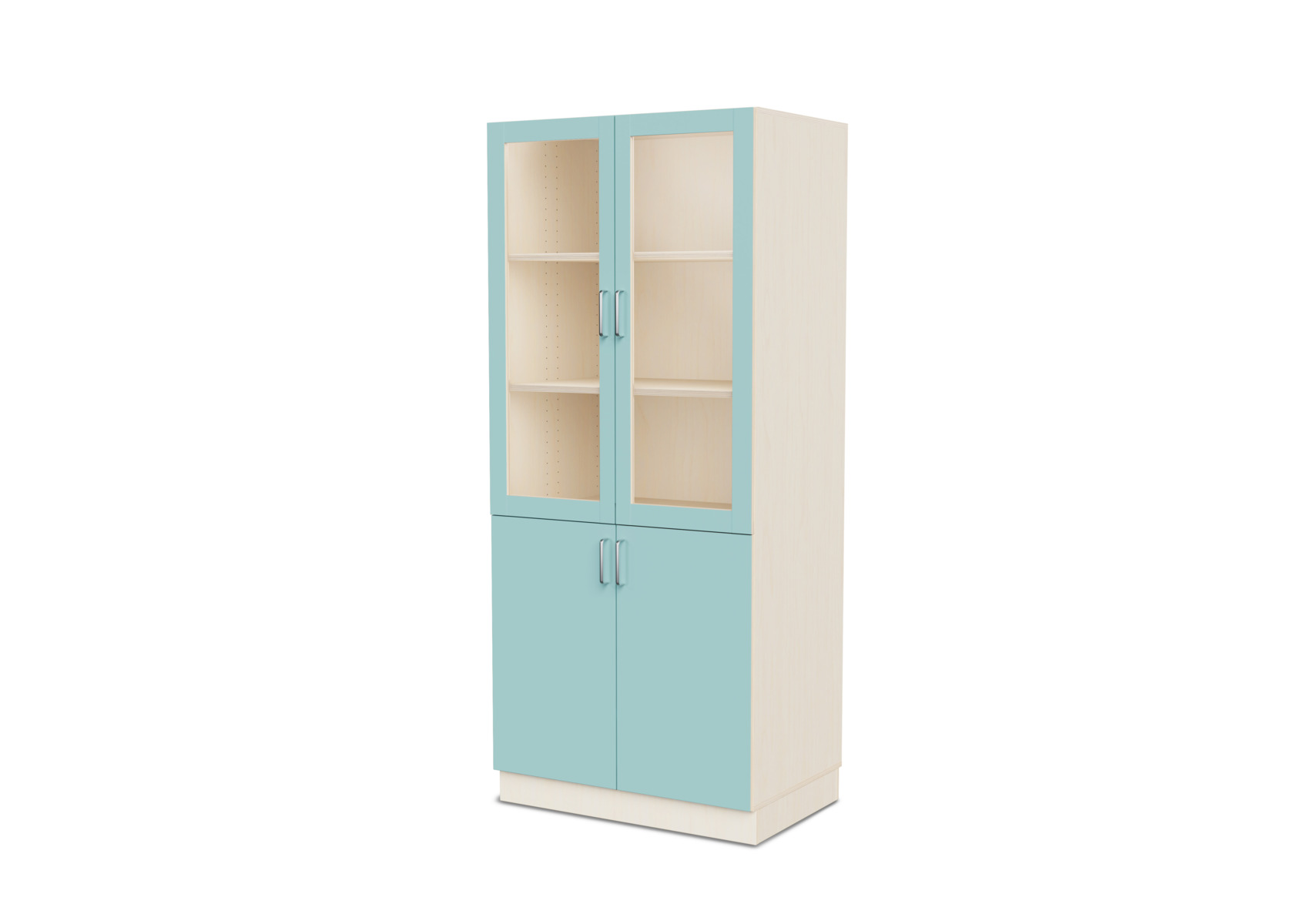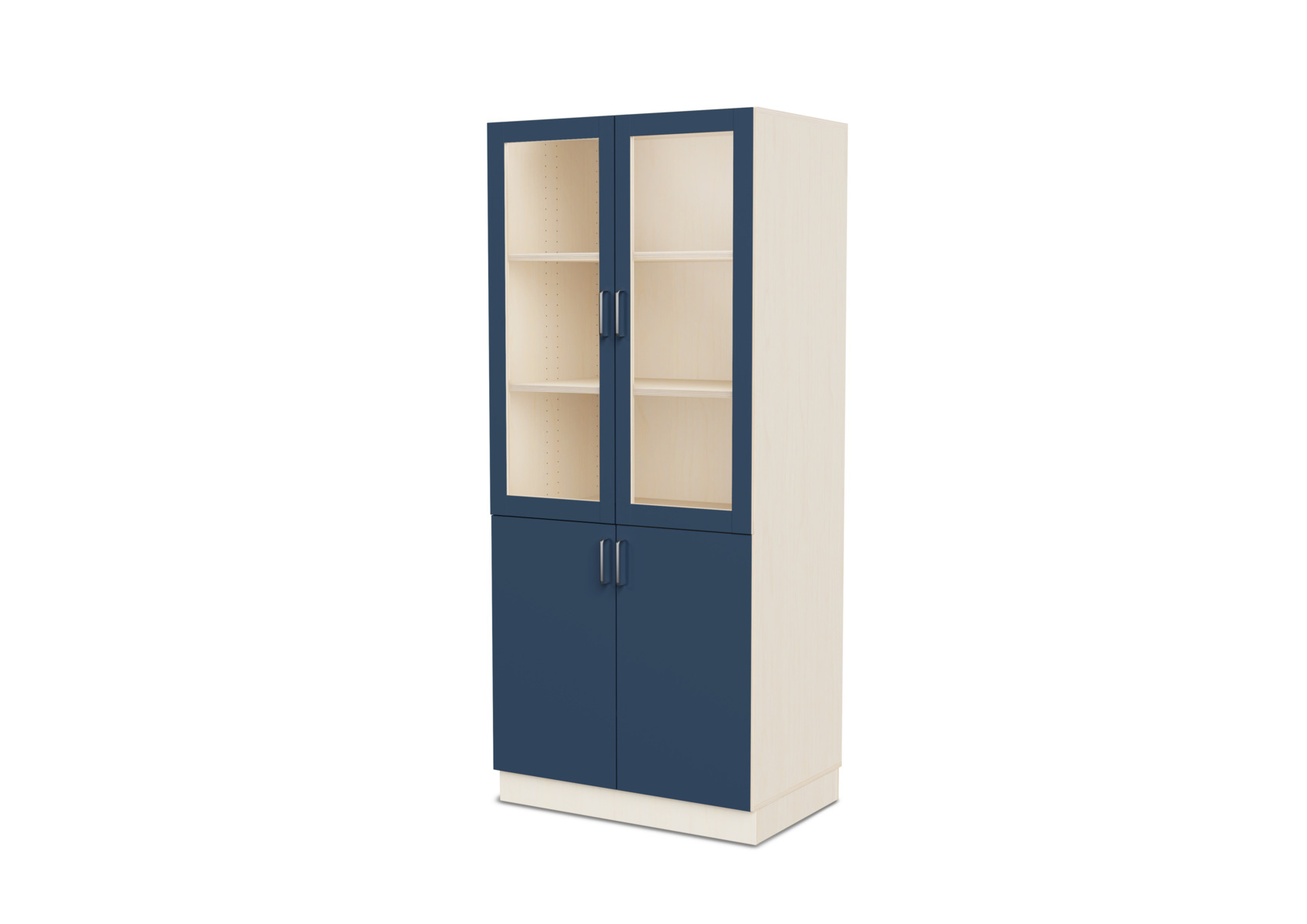 Komplet materialeskab med sokkel og fire hylder. Vinkelbeslag til vægforankring medfølger. Korpus af 18 mm krydsfinér. Dør i højtrykslaminat, birk helt i krydsfinér.