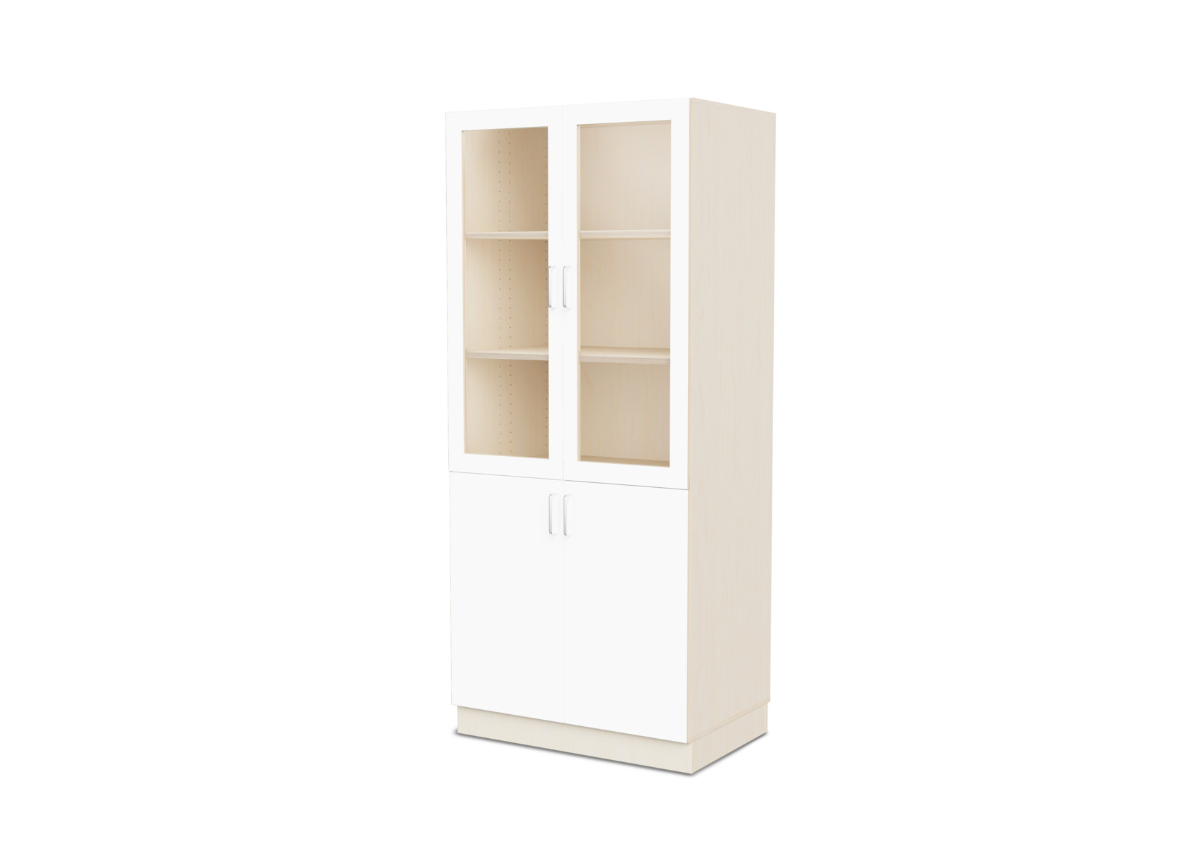 Komplet materialeskab med sokkel og fire hylder. Vinkelbeslag til vægforankring medfølger. Korpus af 18 mm krydsfinér. Dør i højtrykslaminat, hvidpigmenteret helt i krydsfinér.