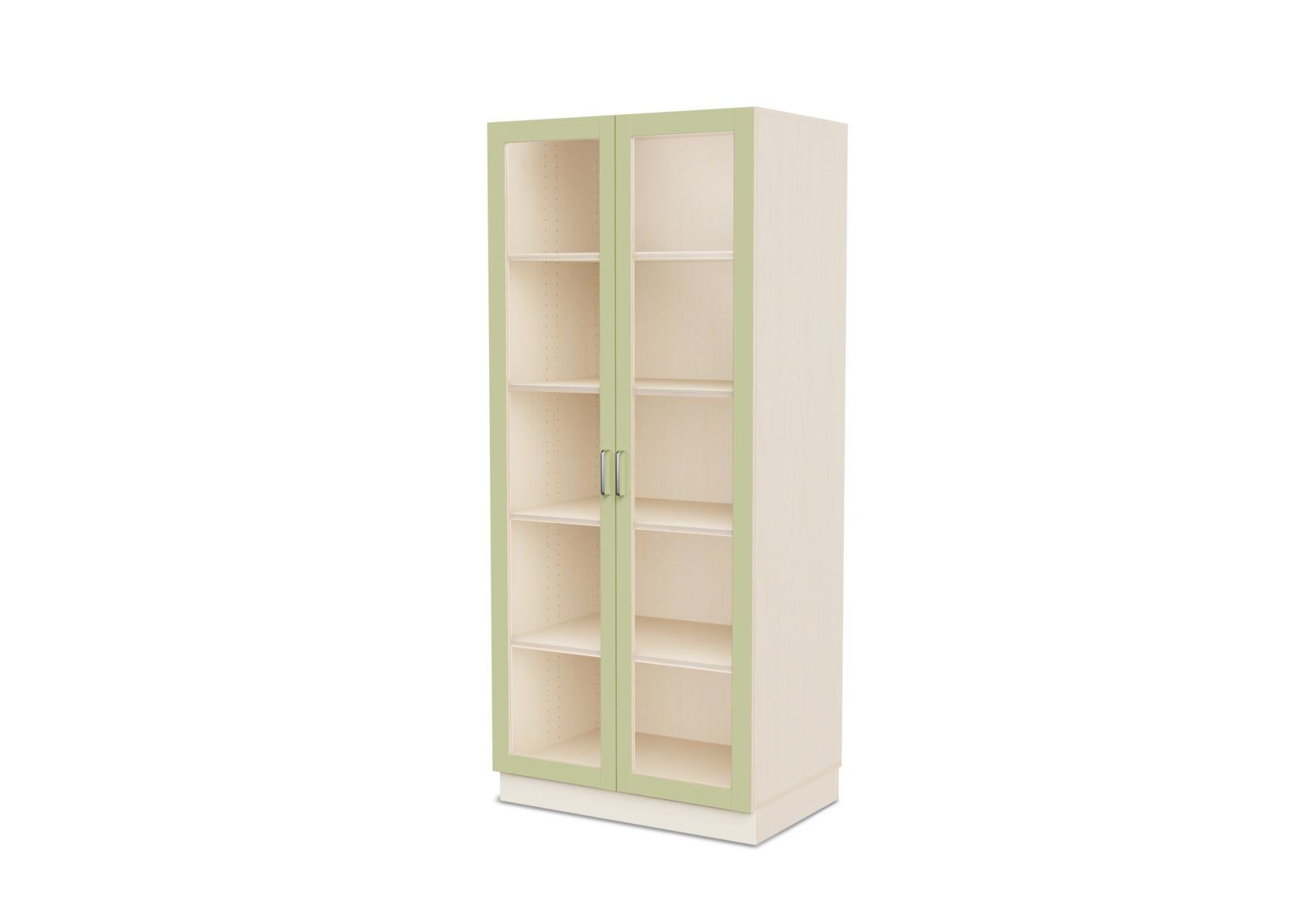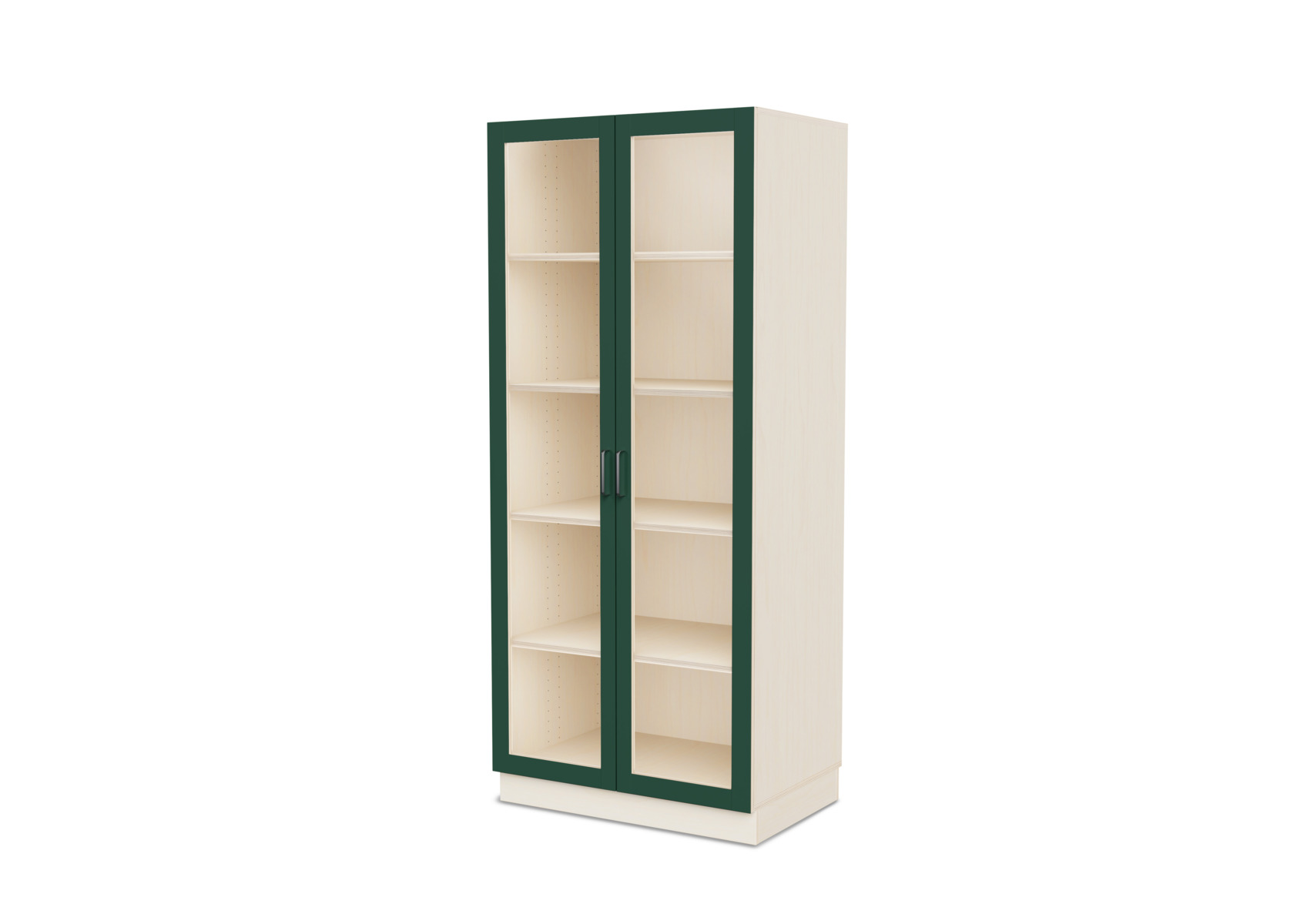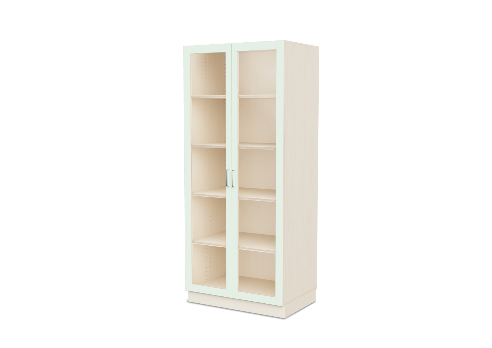 Komplet materialeskab med sokkel og fire hylder. Vinkelbeslag til vægforankring medfølger. Korpus af 18 mm krydsfinér. Dør i højtrykslaminat, birk helt i krydsfinér.