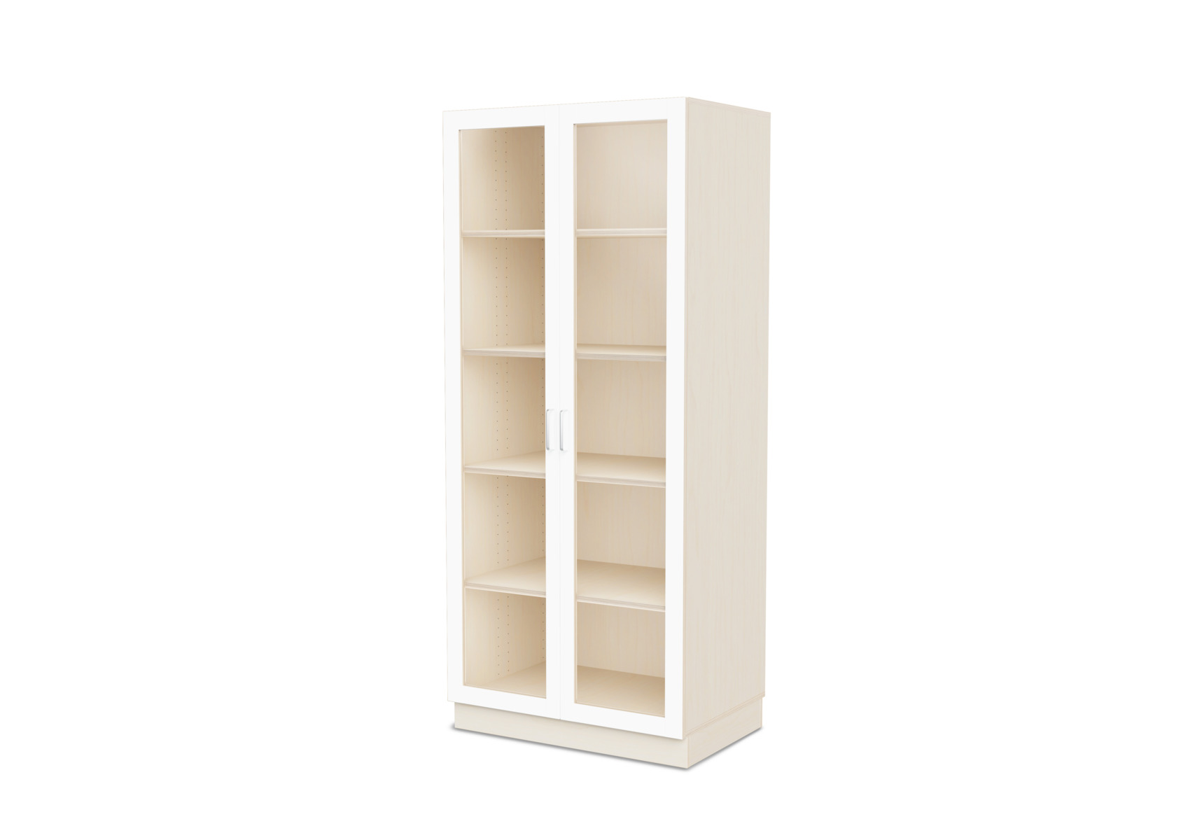 Komplet materialeskab med sokkel og fire hylder. Vinkelbeslag til vægforankring medfølger. Korpus af 18 mm krydsfinér. Dør i højtrykslaminat, hvidpigmenteret helt i krydsfinér.