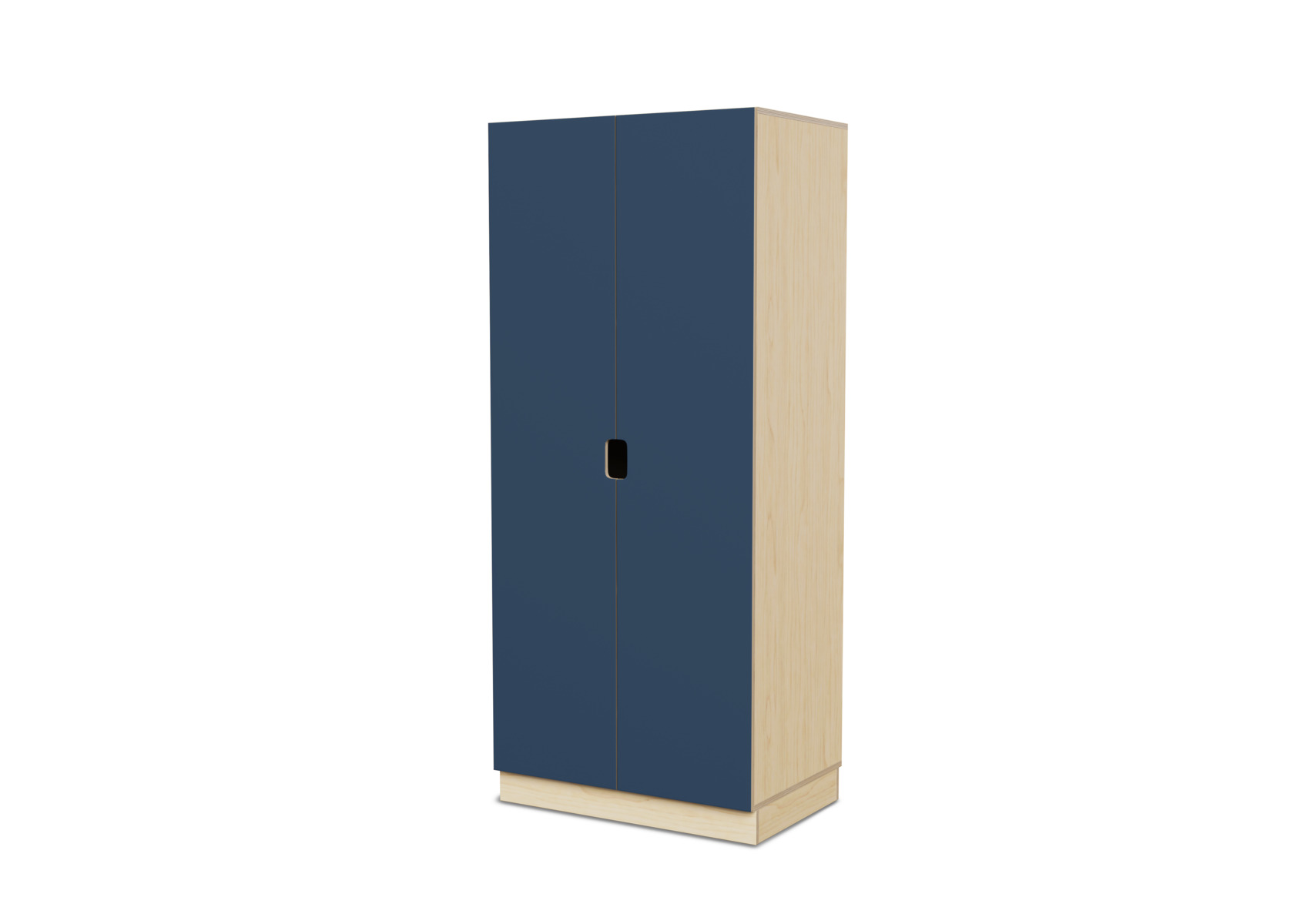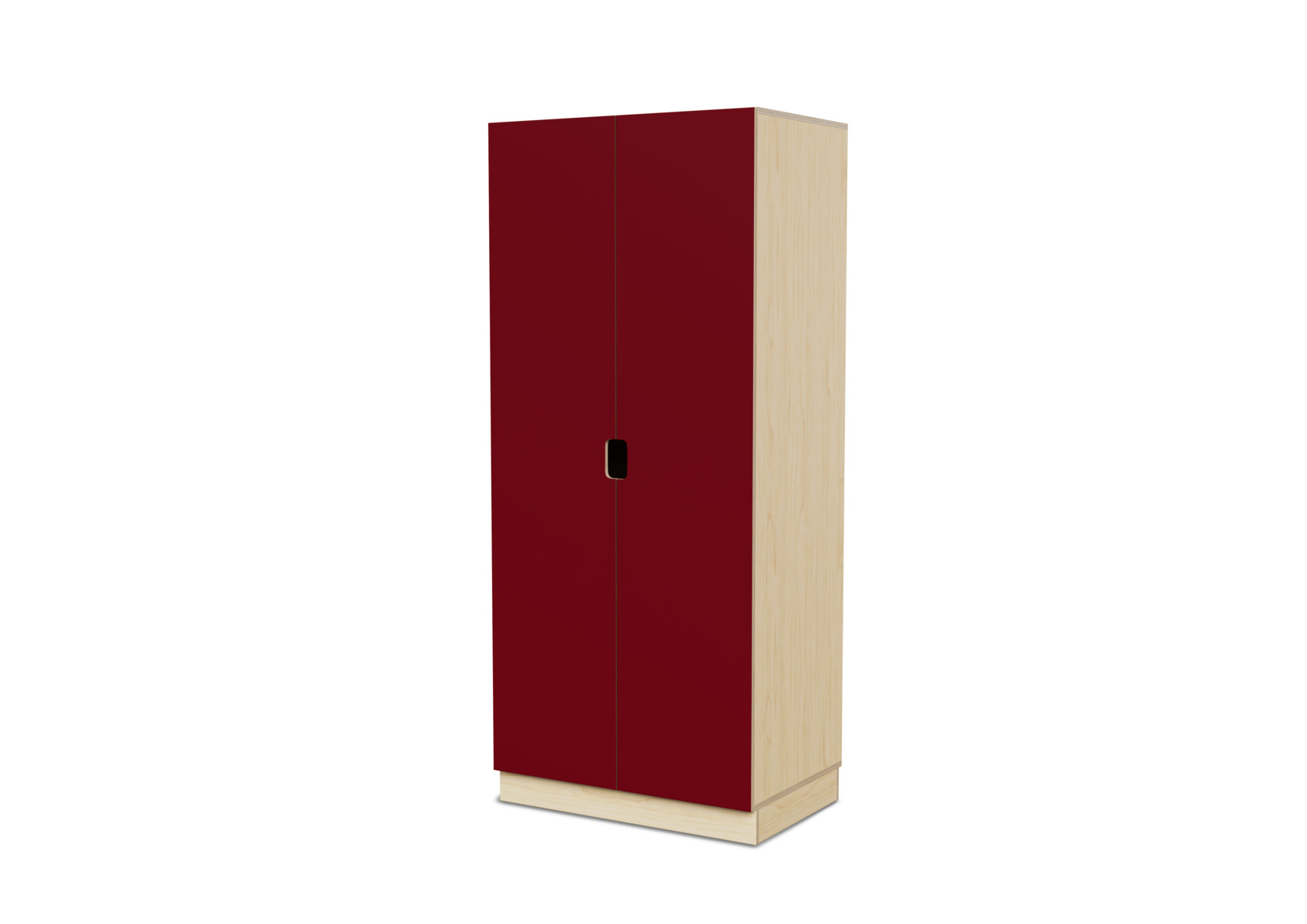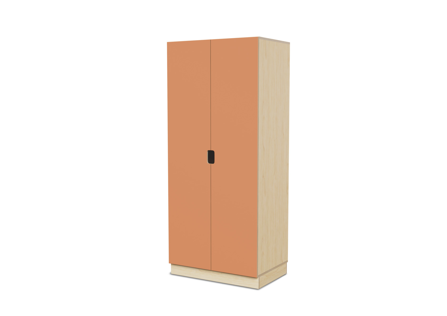 Komplet materialeskab med sokkel og fire hylder. Vinkelbeslag til vægforankring medfølger. Korpus af 18 mm krydsfinér. Dør i højtrykslaminat, birk helt i krydsfinér.