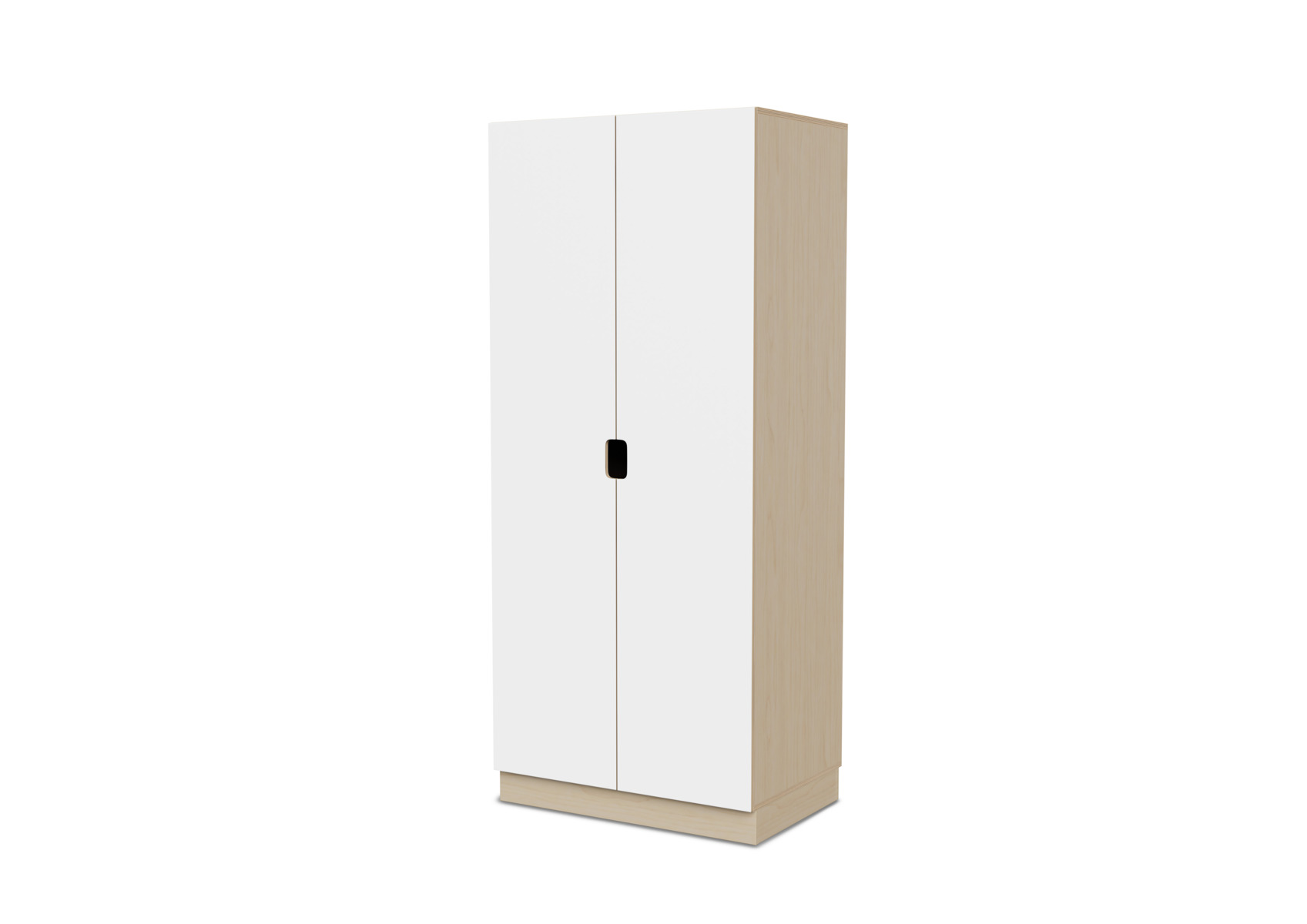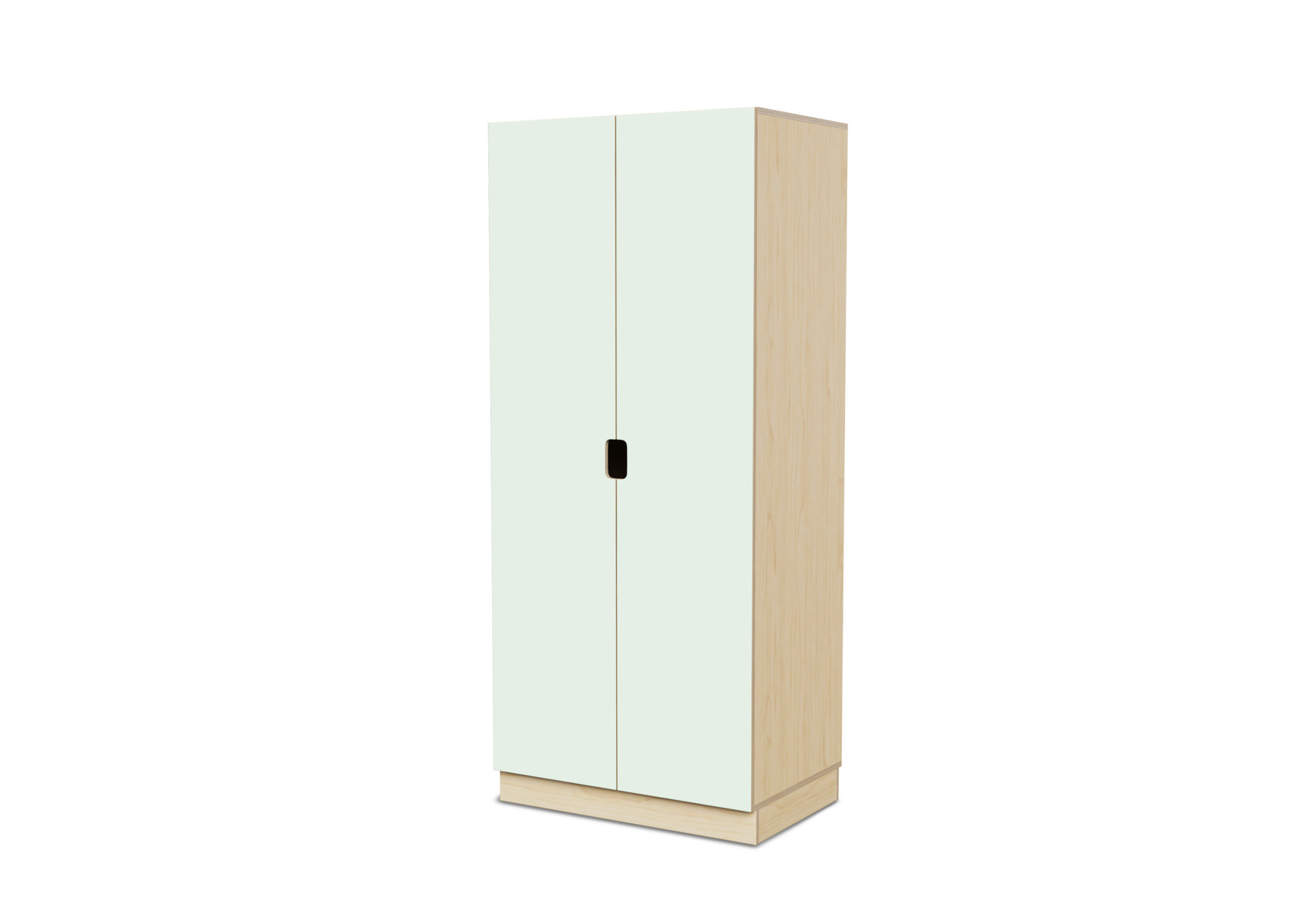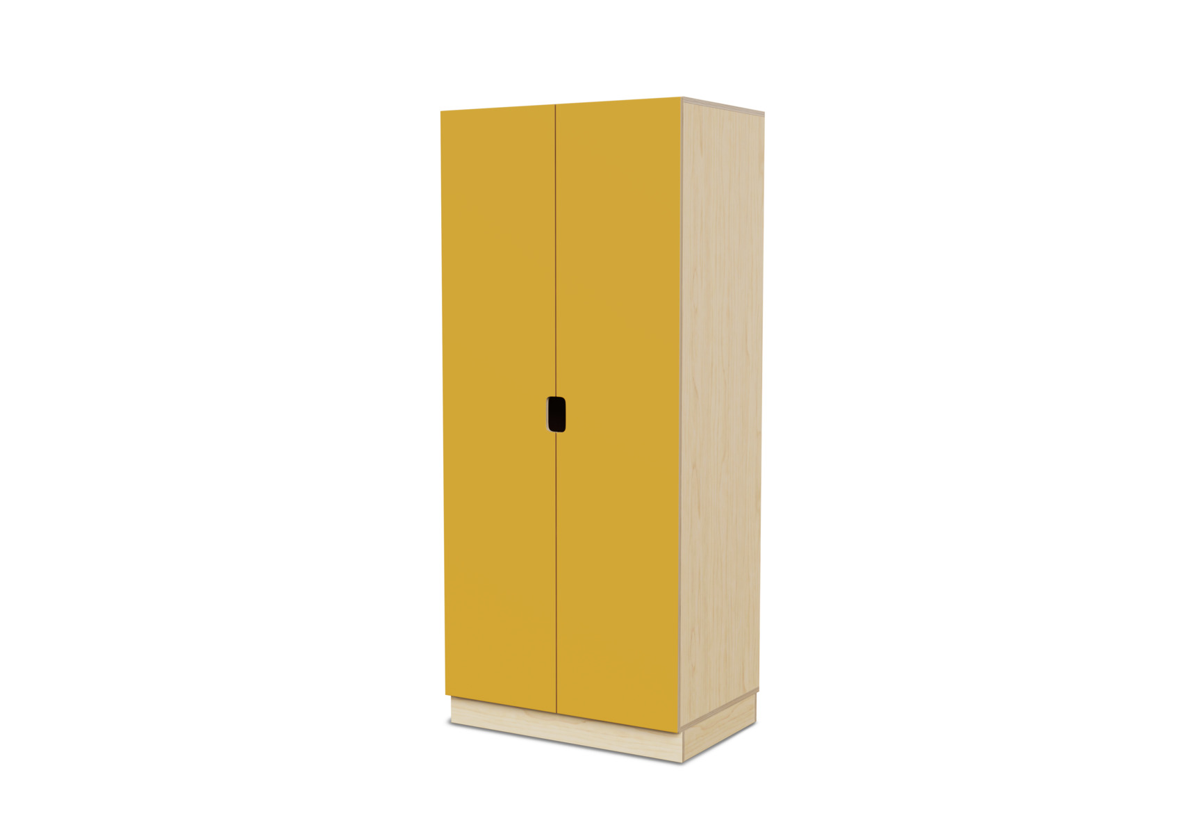 Komplet materialeskab med sokkel og fire hylder. Vinkelbeslag til vægforankring medfølger. Korpus af 18 mm krydsfinér. Dør i højtrykslaminat, birk helt i krydsfinér.