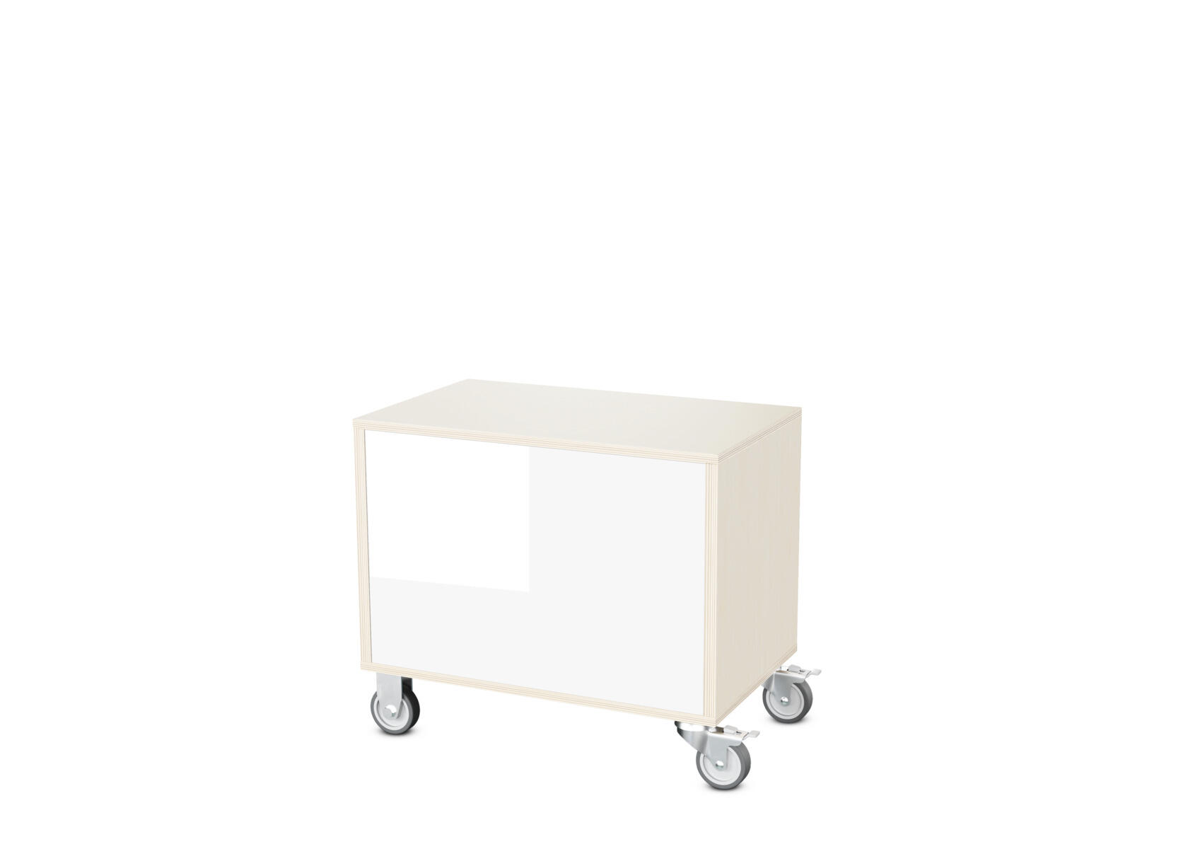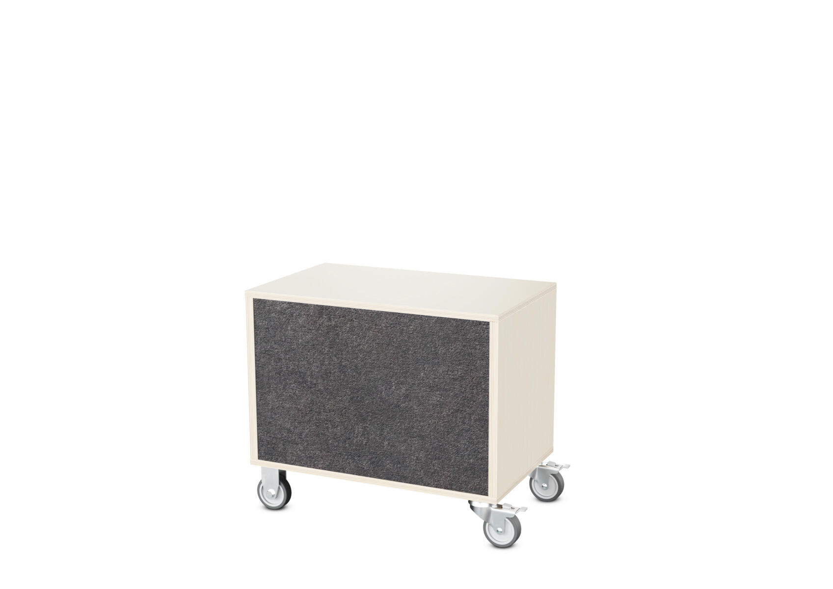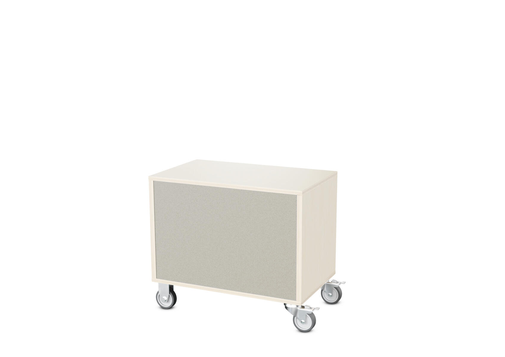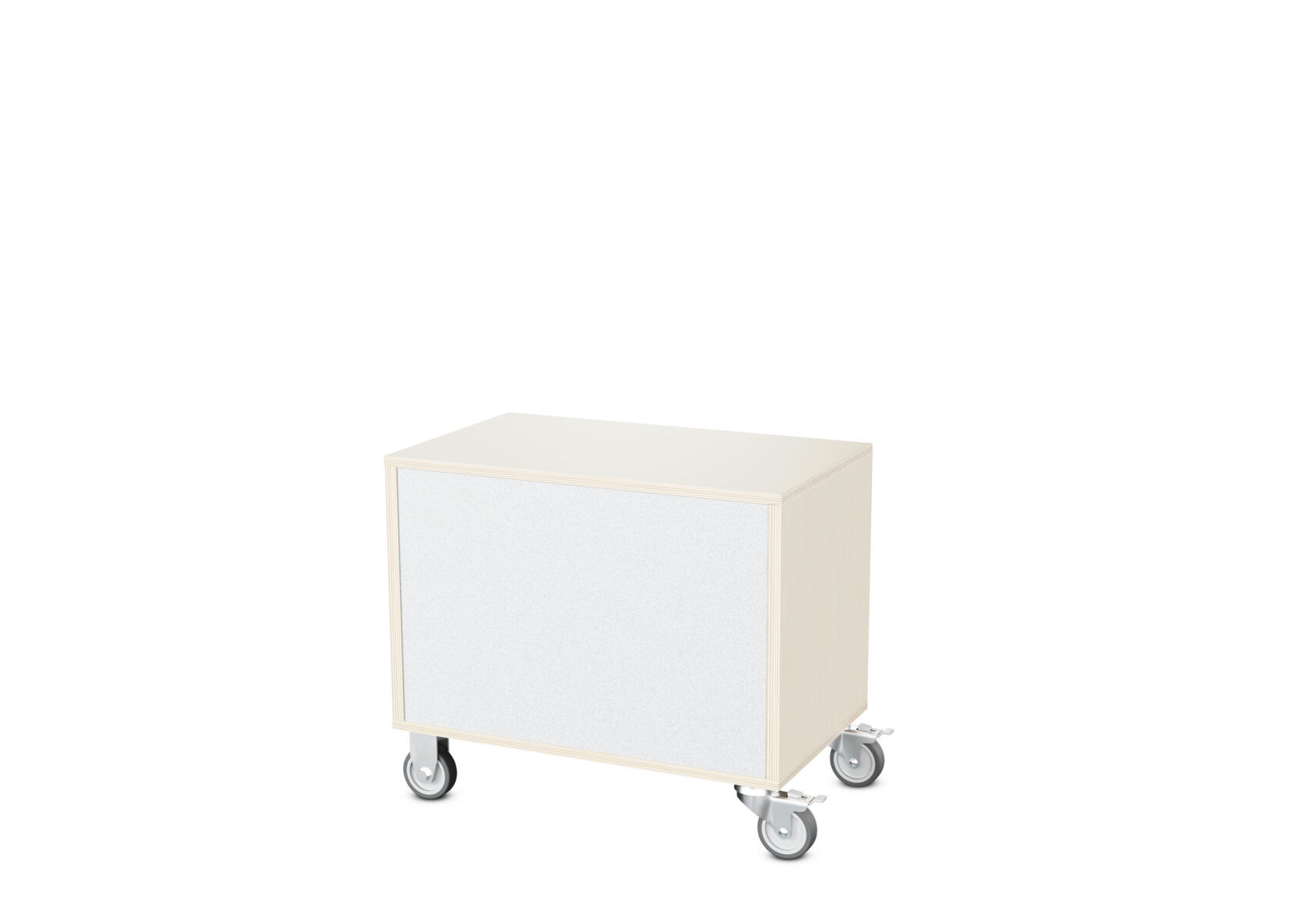 Opbevaring med mulighed for at vælge forskellige rygge, så den passer til forskellige behov. Uden forborede huller til justerbare hylder og med faste mellemvægge. Fire hjul, hvoraf 2 er faste og 2 drejelige med bremse.