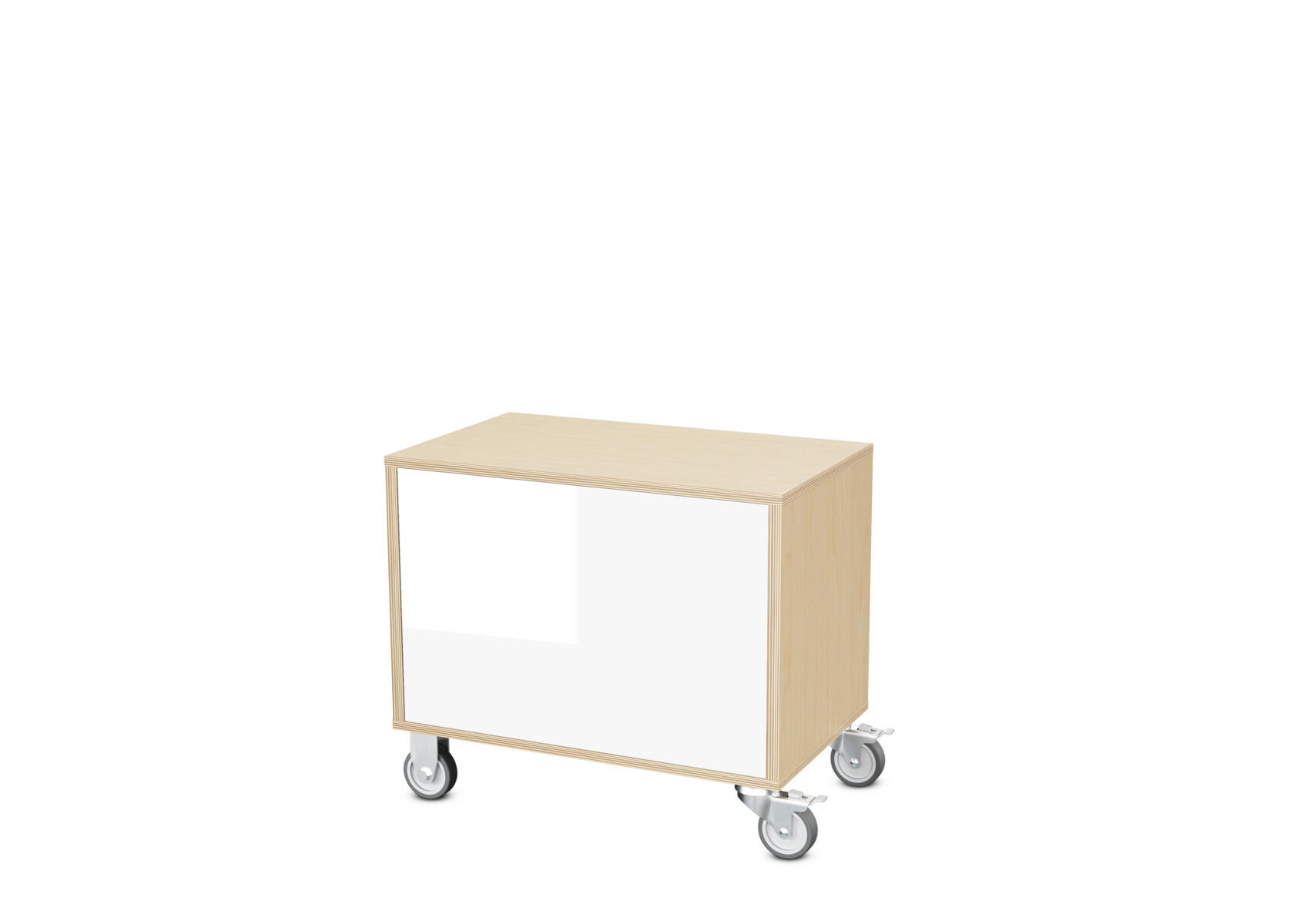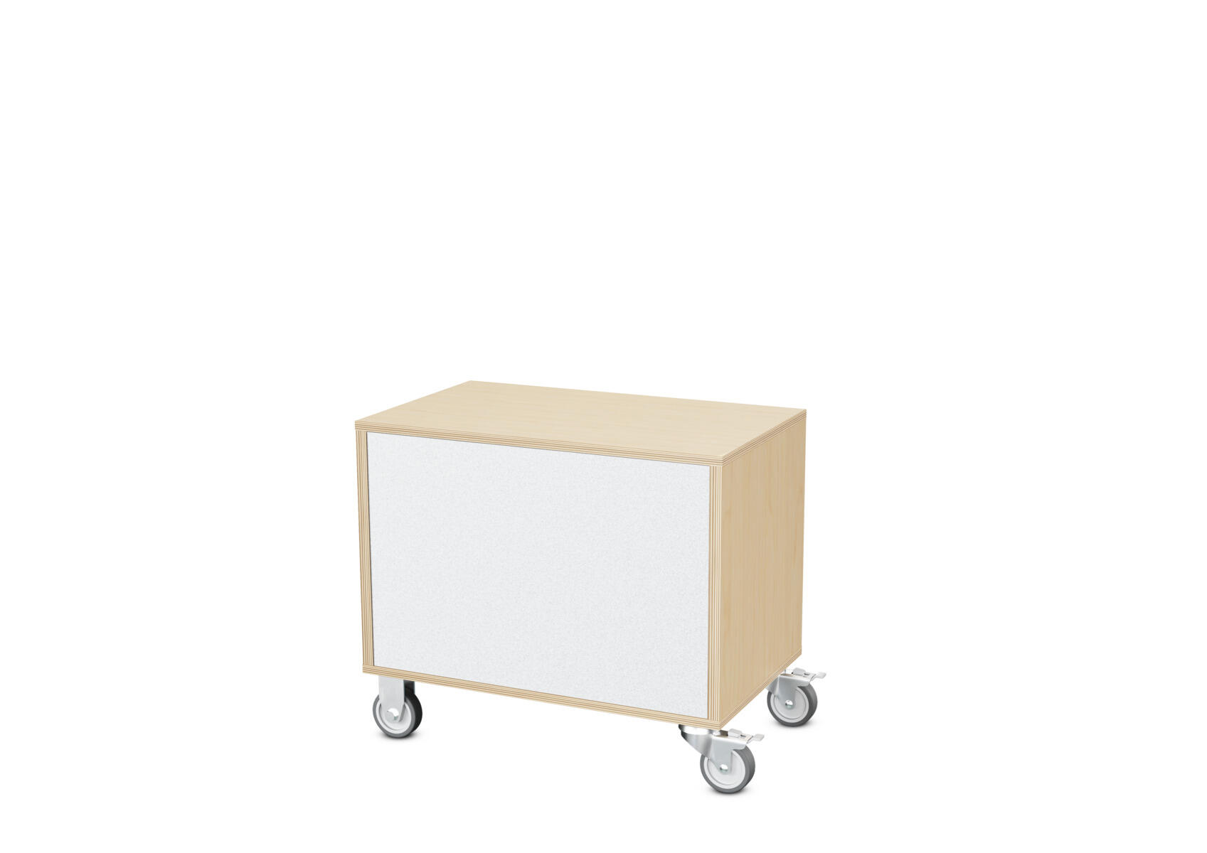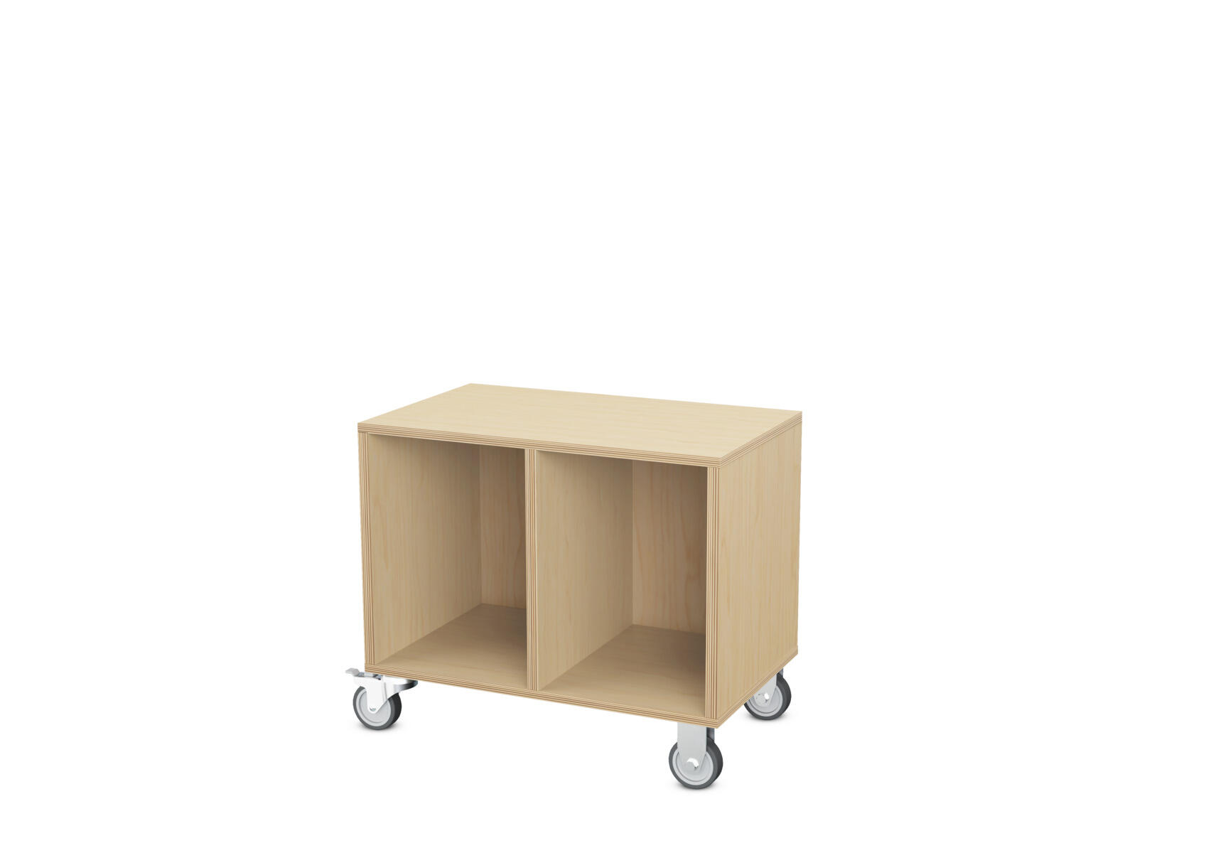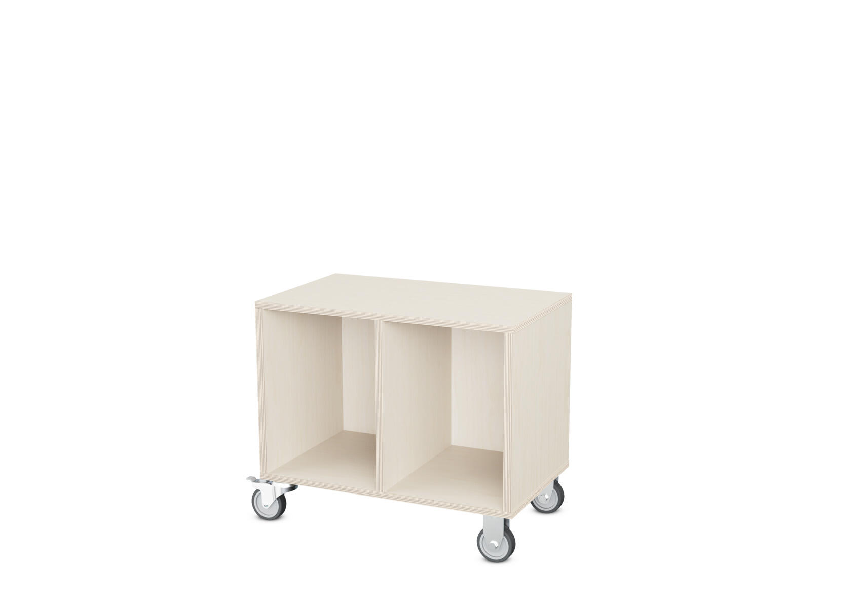 Opbevaring med mulighed for at vælge forskellige rygge, så den passer til forskellige behov. Uden forborede huller til justerbare hylder og med faste mellemvægge. Fire hjul, hvoraf 2 er faste og 2 drejelige med bremse.