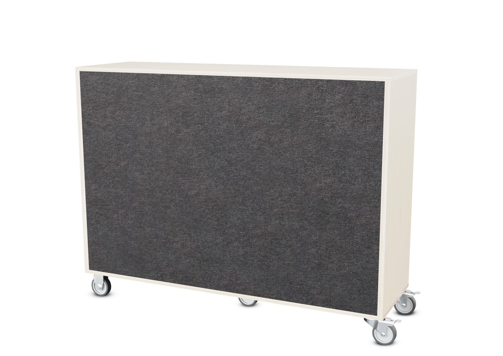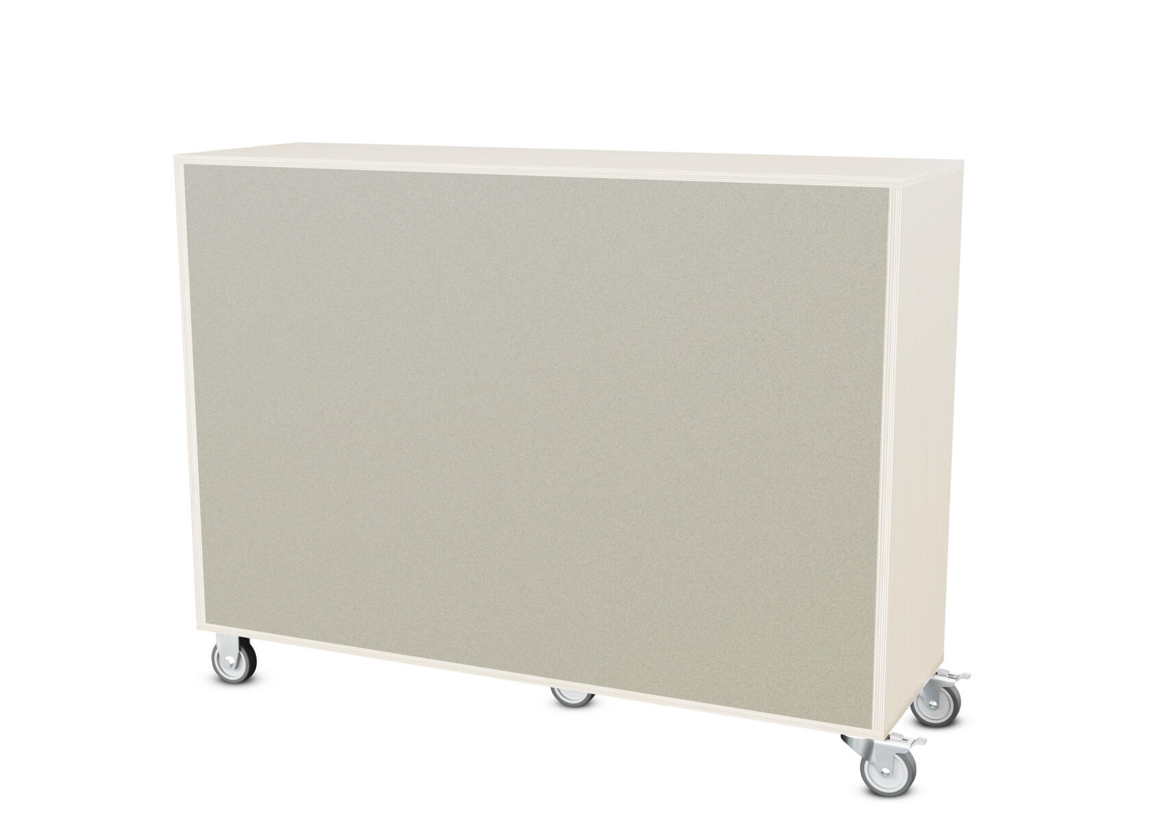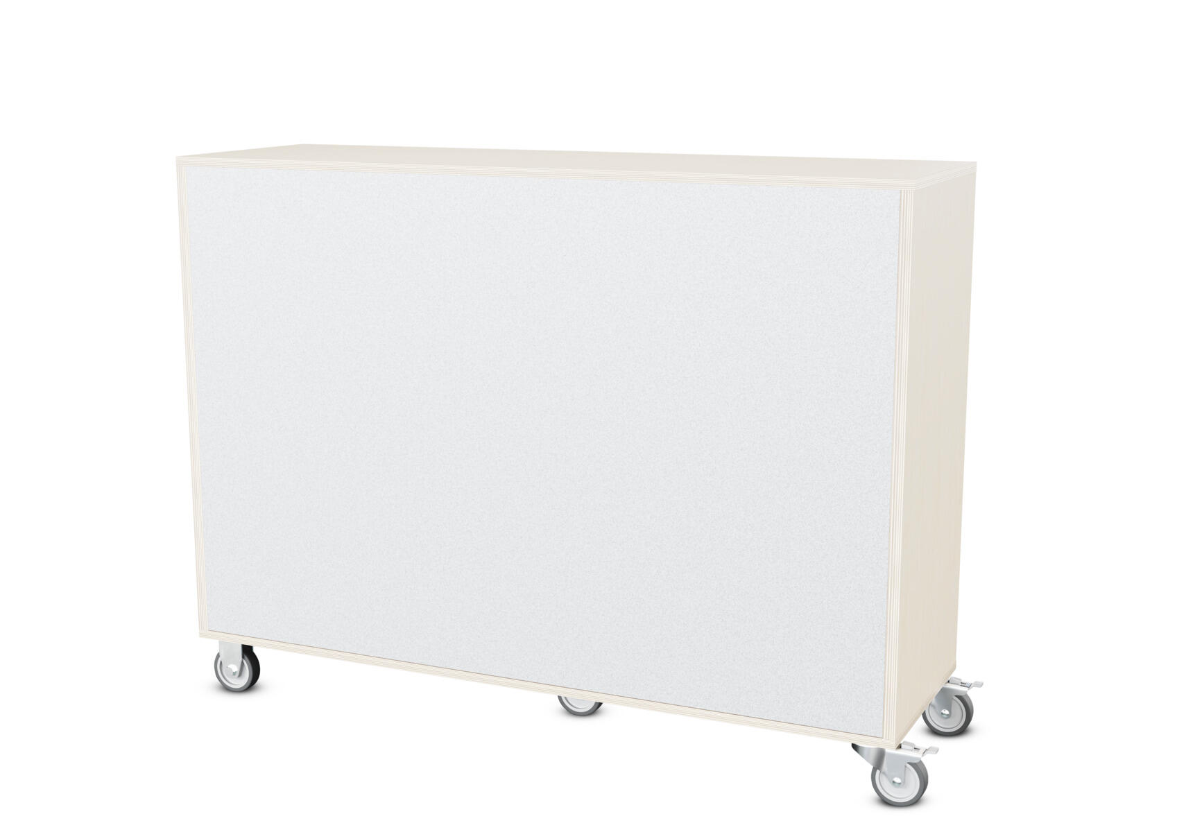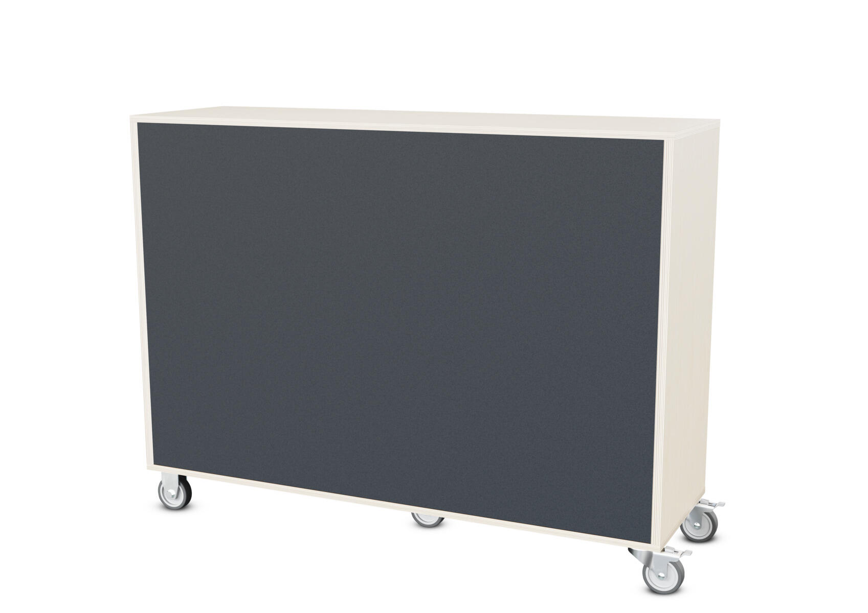 Opbevaring med mulighed for at vælge forskellige rygge, så den passer til forskellige behov. Uden forborede huller til justerbare hylder og med faste mellemvægge. Fire hjul, hvoraf 2 er faste og 2 drejelige med bremse.