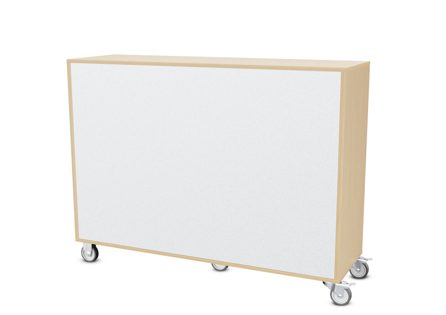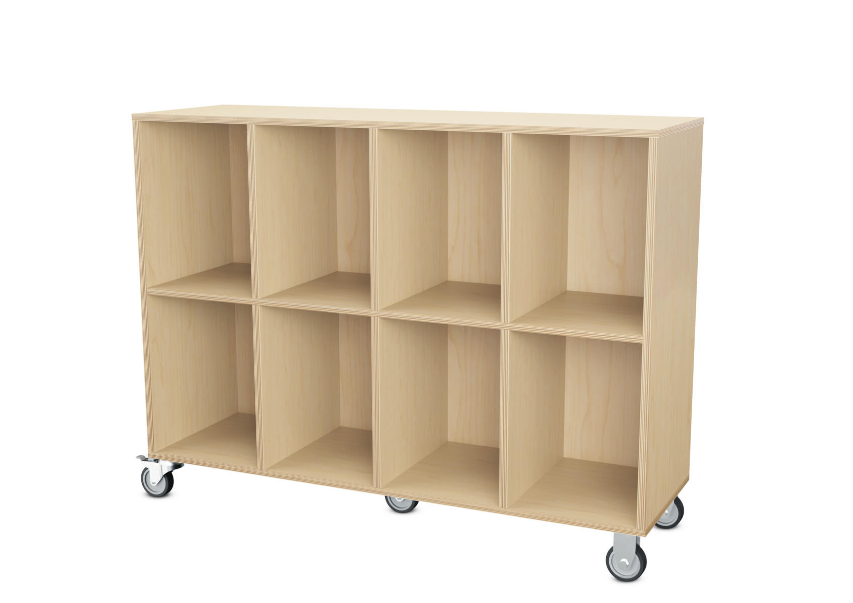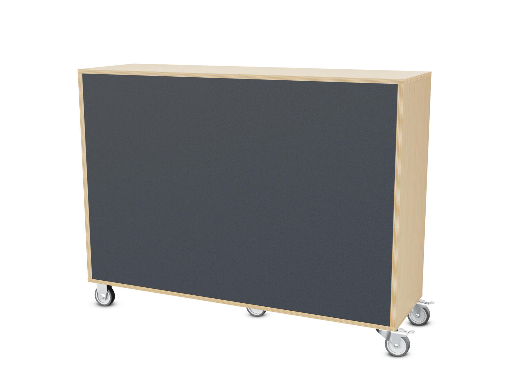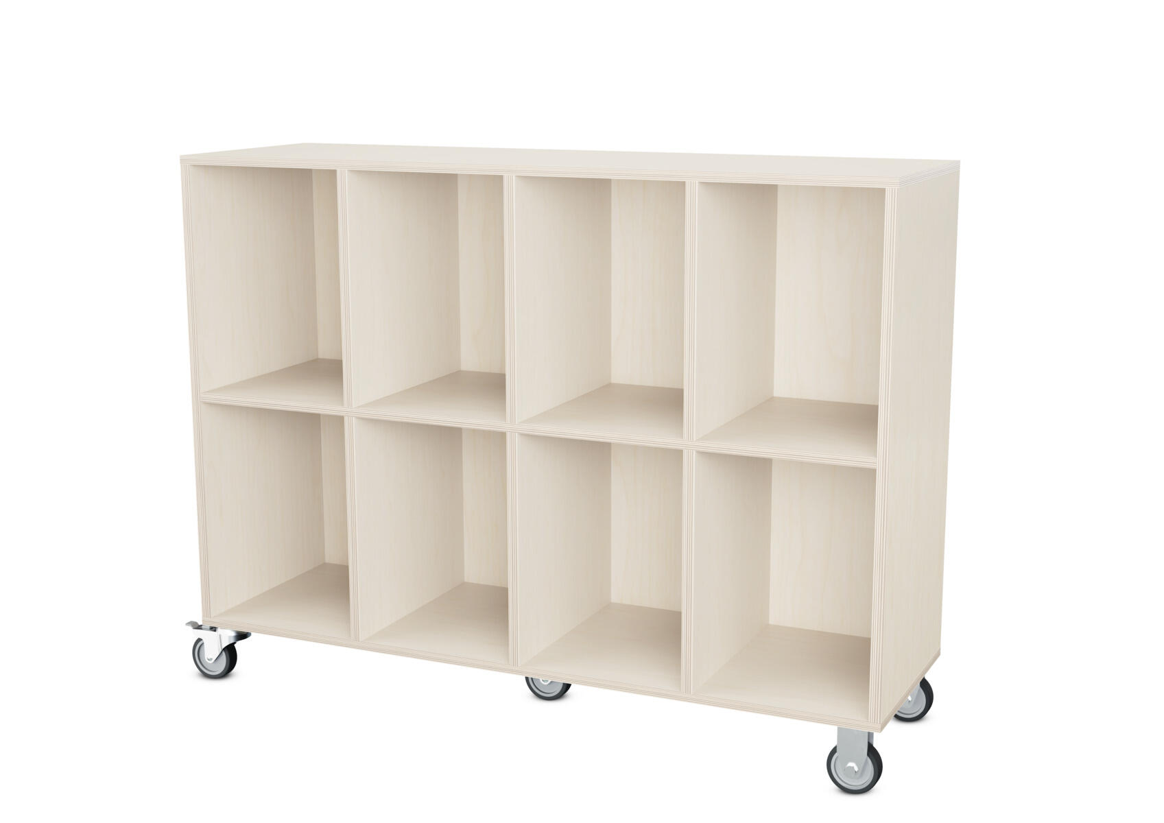 Opbevaring med mulighed for at vælge forskellige rygge, så den passer til forskellige behov. Uden forborede huller til justerbare hylder og med faste mellemvægge. Fire hjul, hvoraf 2 er faste og 2 drejelige med bremse.
