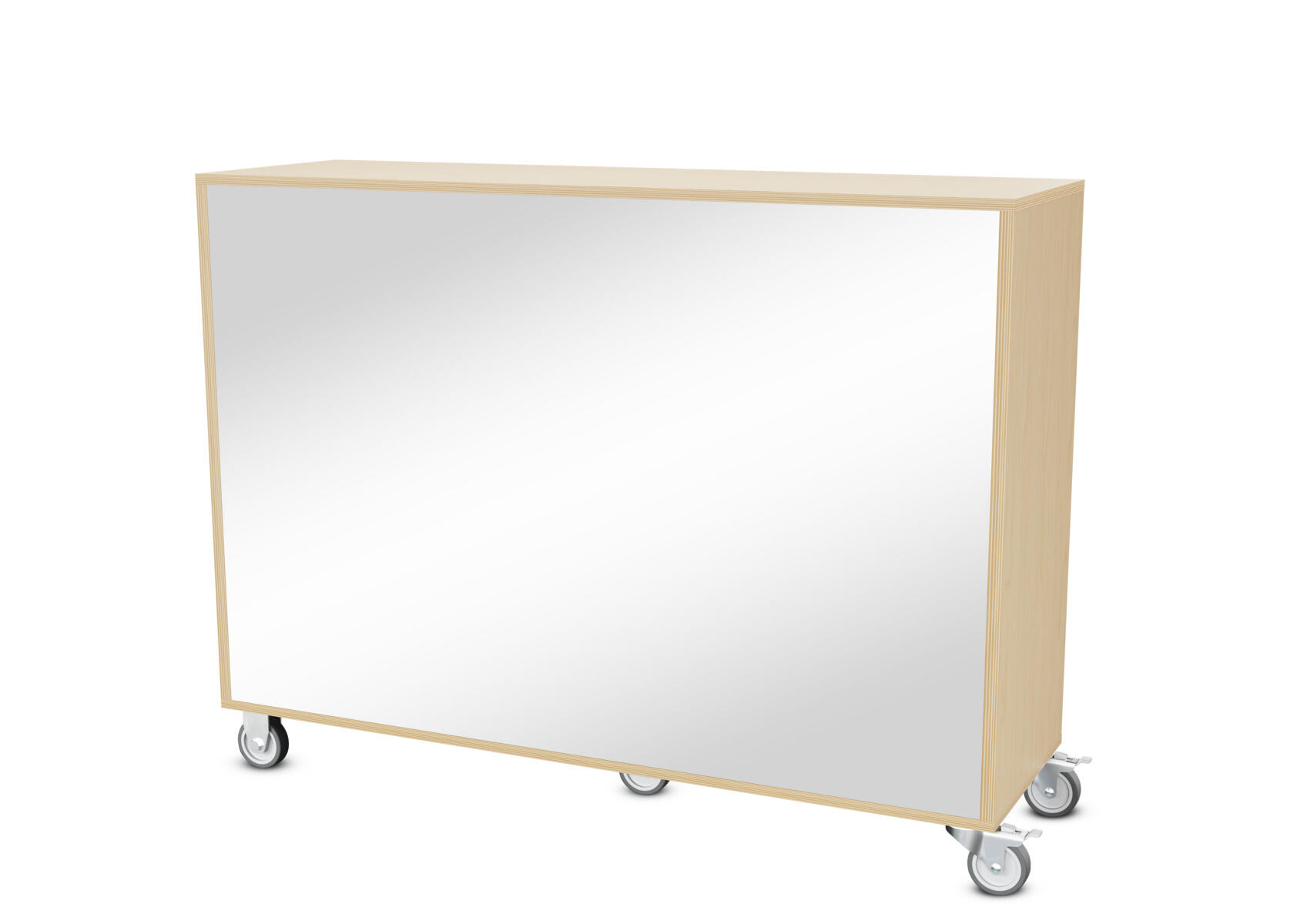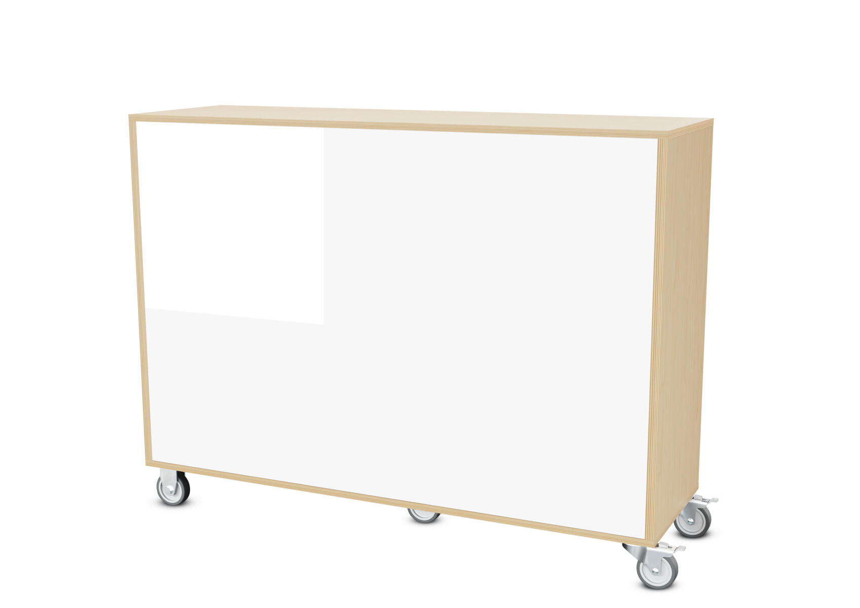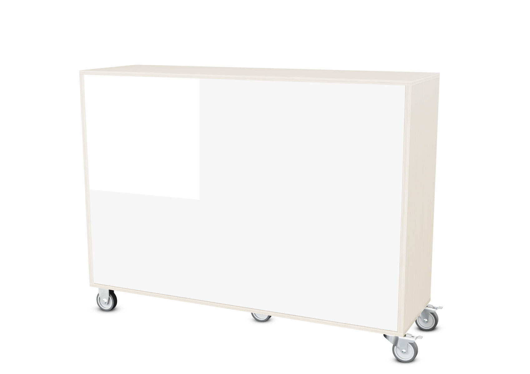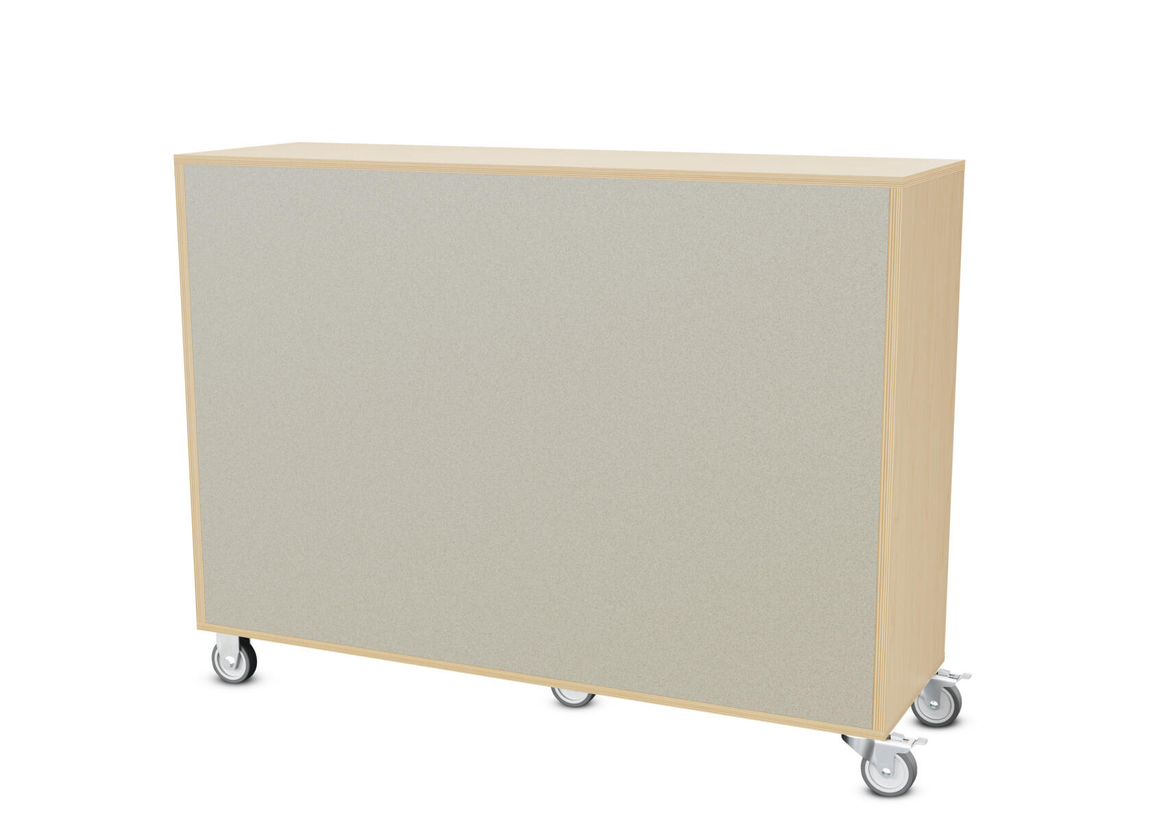 Opbevaring med mulighed for at vælge forskellige rygge, så den passer til forskellige behov. Uden forborede huller til justerbare hylder og med faste mellemvægge. Fire hjul, hvoraf 2 er faste og 2 drejelige med bremse.