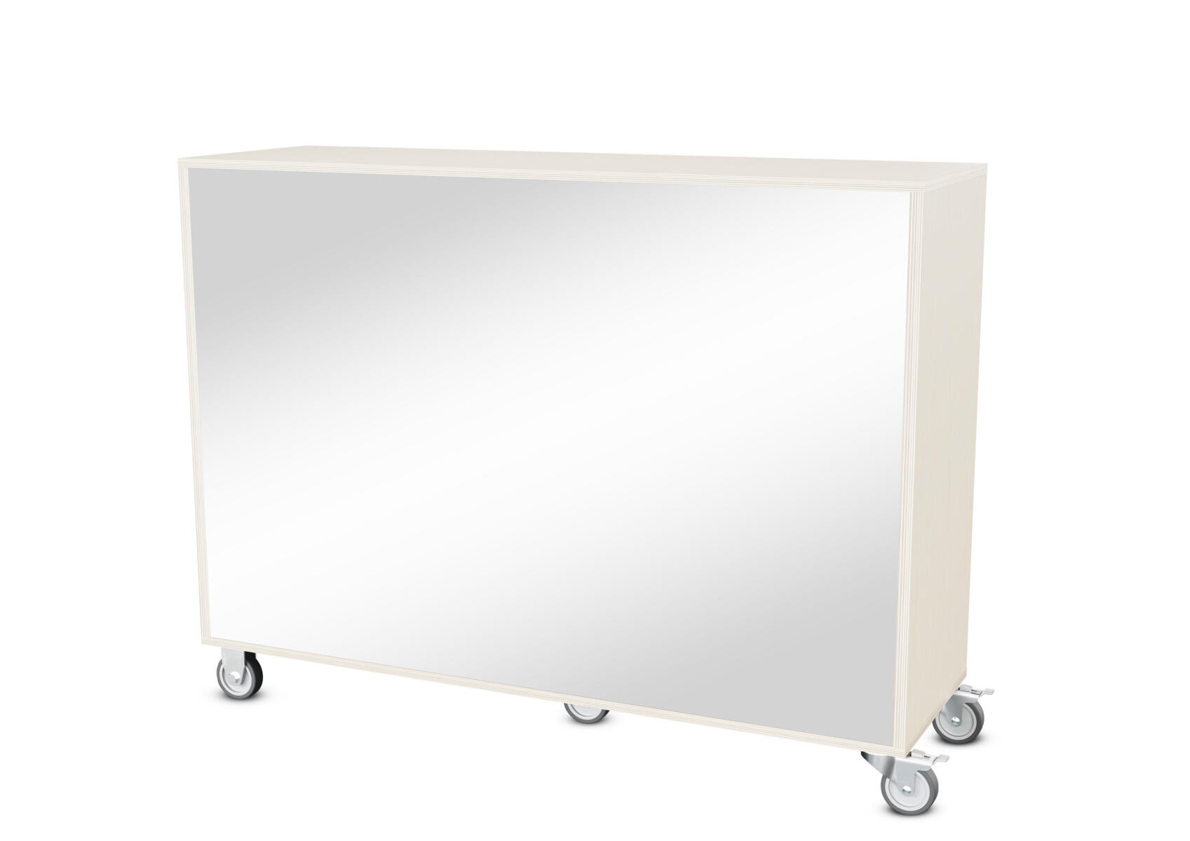 Opbevaring med mulighed for at vælge forskellige rygge, så den passer til forskellige behov. Uden forborede huller til justerbare hylder og med faste mellemvægge. Fem hjul, hvoraf 2 er faste og 2 drejelige med bremse.