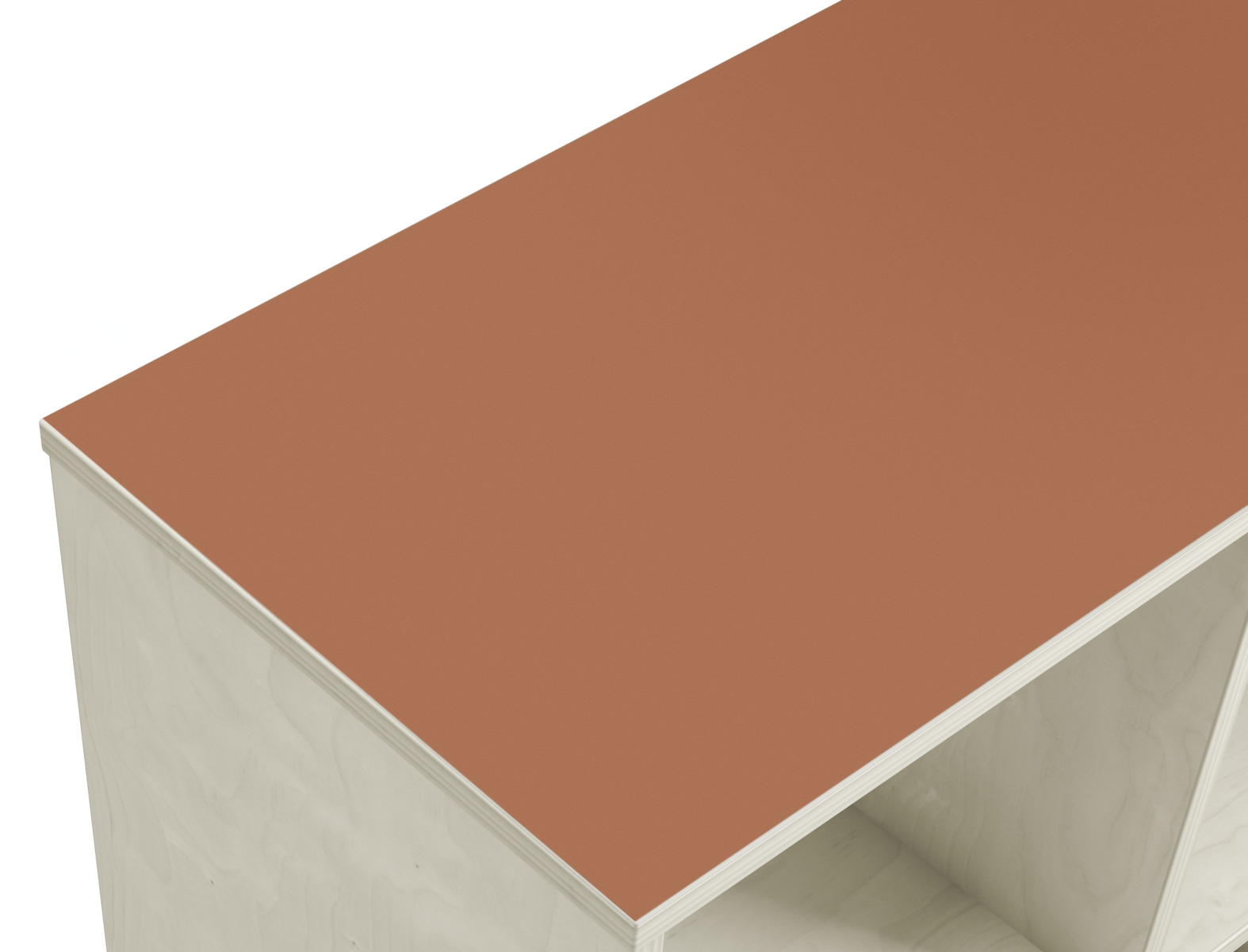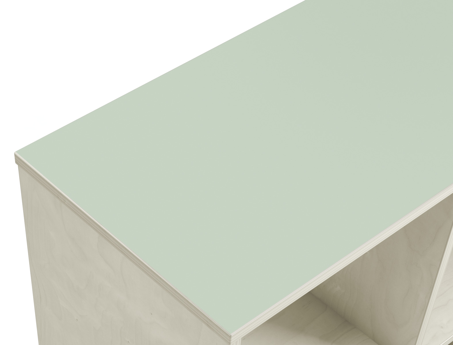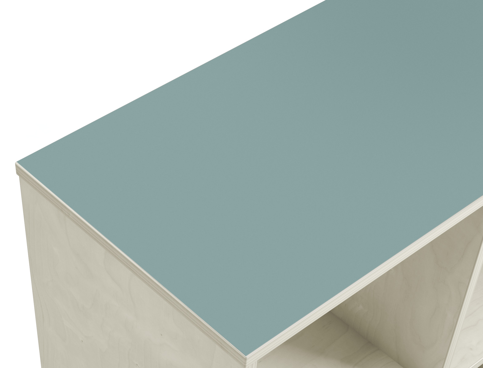 Mål pr. rum: Bredde 57,3 cm, højde 20 cm. Vælg farve på højtrykslaminat til toppen. Ved valg af krydsfinér/hvidpigmenteret er hele opbevaringsreolen udført i plywood. 2 drejelige og 2 faste hjul med bremse.