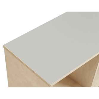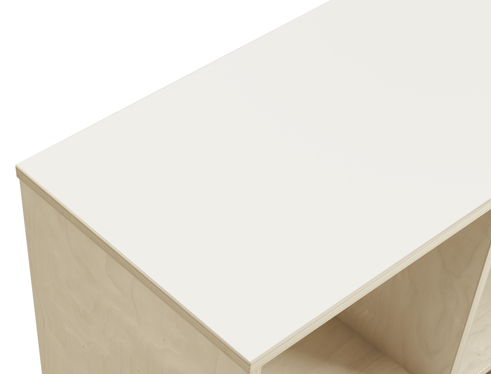 Reolopbevaring uden ryg. Vælg farve på højtrykslaminat på toppen. Ved valg af hvidpigmenteret som top er reolen helt i krydsfiner. Produceret i høj kvalitet birkekrydsfinér. Leveres med 2 faste hjul til den ene kortsiden og 2 bevægelige, men låsbare, hjul til den anden. Forborede huller til nem montering af hjul. Kubus opbevaringskasser passer ikke til denne opbevaring. Svanemærket, licensnummer 5031 0099.