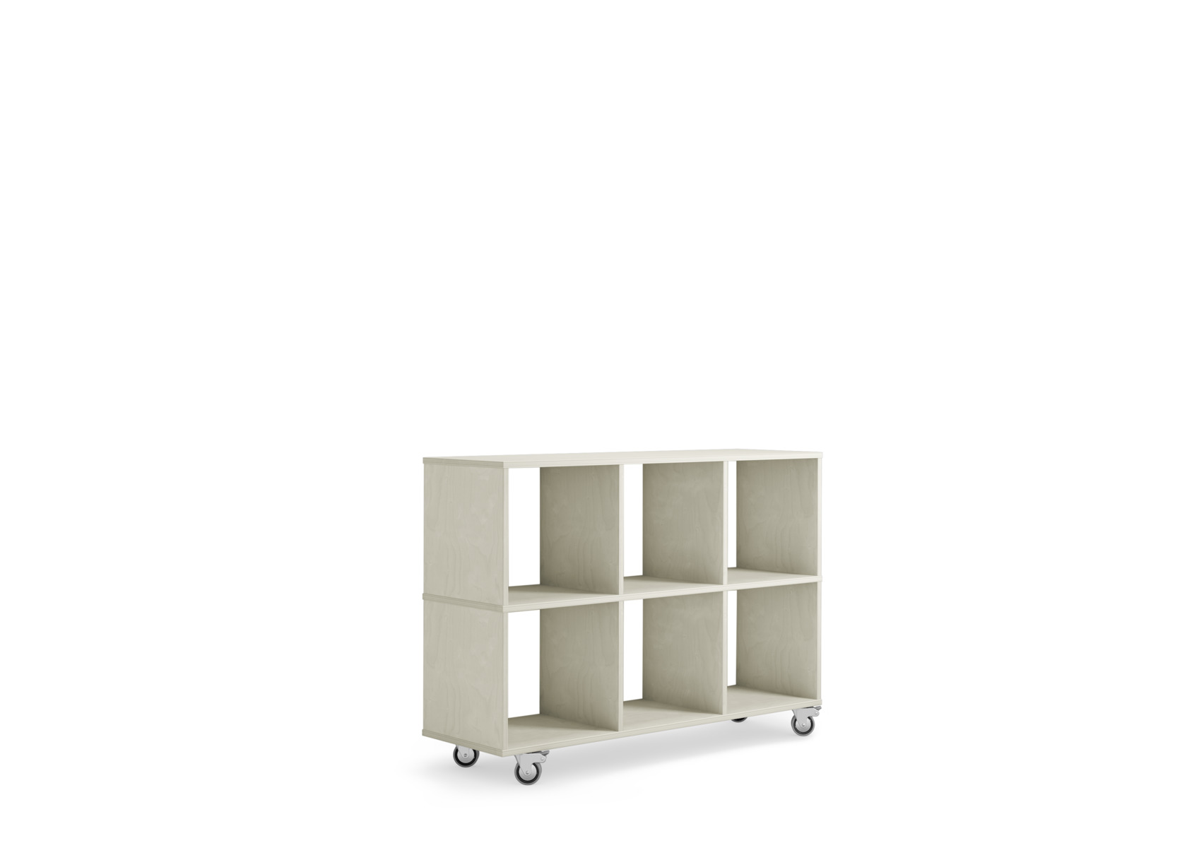 Reolopbevaring uden ryg. Vælg farve på højtrykslaminat på toppen. Ved valg af hvidpigmenteret som top er reolen helt i krydsfiner. Produceret i høj kvalitet birkekrydsfinér. Leveres med 2 faste hjul til den ene kortsiden og 2 bevægelige, men låsbare, hjul til den anden. Forborede huller til nem montering af hjul. Kubus opbevaringskasser passer ikke til denne opbevaring. Svanemærket, licensnummer 5031 0099.