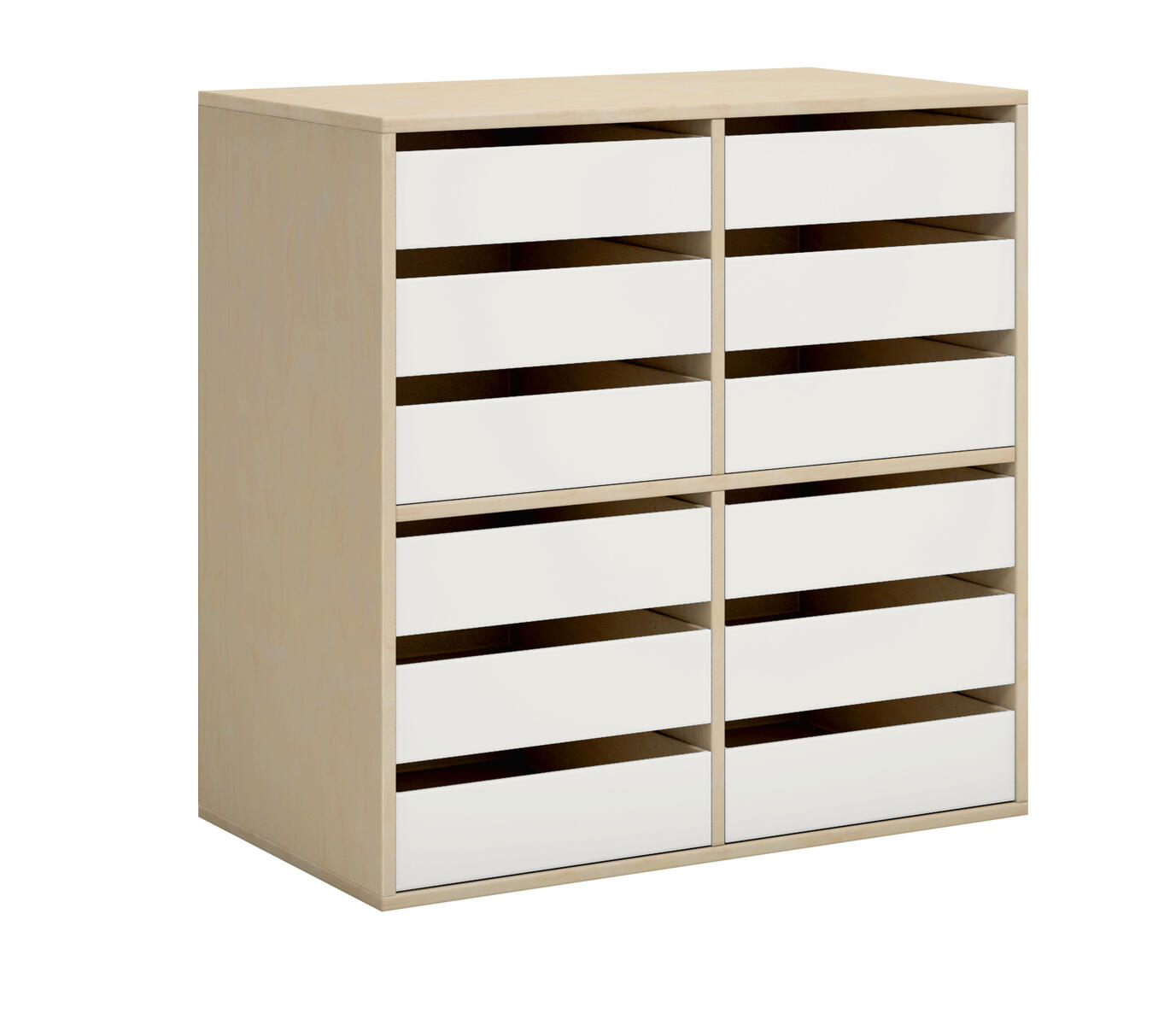 Elevreol i decor laminat. Med 12 skuffer. Skuffefronter fås i decor laminat eller højtrykslaminat. Kompletteres med sokkel eller hjulplade. Kan også kompletteres med døre (varenr. 80685). Skuffernes indermål: B34xD33,6xH4,1 cm.