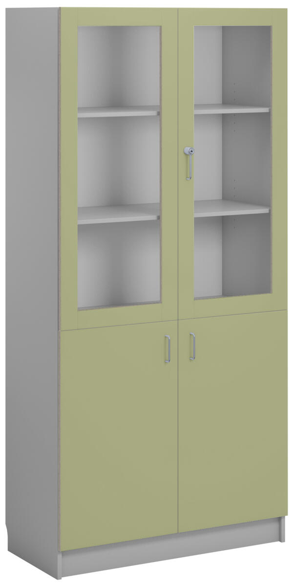 Materialeskab med korpus i decor laminat. Fronter i decor laminat eller højtrykslaminat. Indeholder 5 hylder, hvoraf 3 er flytbare. 2 døre i hærdet glas med cylinderlås (inkl. 2 nøgler) og 2 døre i hærdet glas med håndtag. Dørene kan åbnes i 170° vinkel.