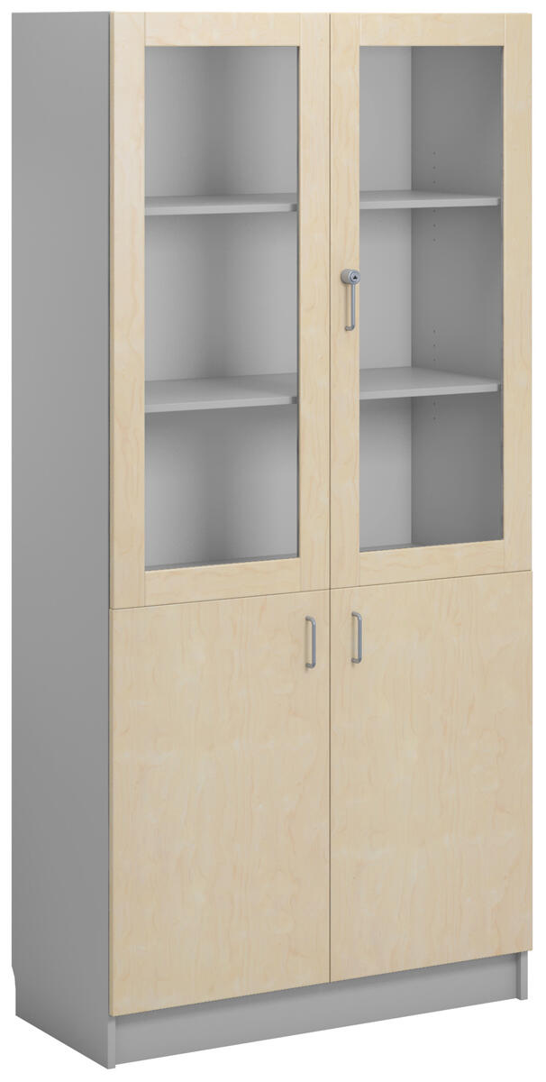 Materialeskab med korpus i decor laminat. Fronter i decor laminat eller højtrykslaminat. Indeholder 5 hylder, hvoraf 3 er flytbare. 2 låger i hærdet glas med cylinderlås (inkl. 2 nøgler) og 2 lukkede låger med greb. Lågerne kan åbnes i en vinkel på 170°.
