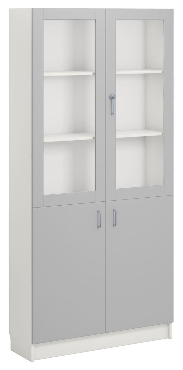 Materialeskab med korpus i decor laminat. Fronter i decor laminat eller højtrykslaminat. Indeholder 5 hylder, hvoraf 3 er flytbare. 2 låger i hærdet glas med cylinderlås (inkl. 2 nøgler) og 2 lukkede låger med greb. Lågerne kan åbnes i en vinkel på 170°.