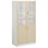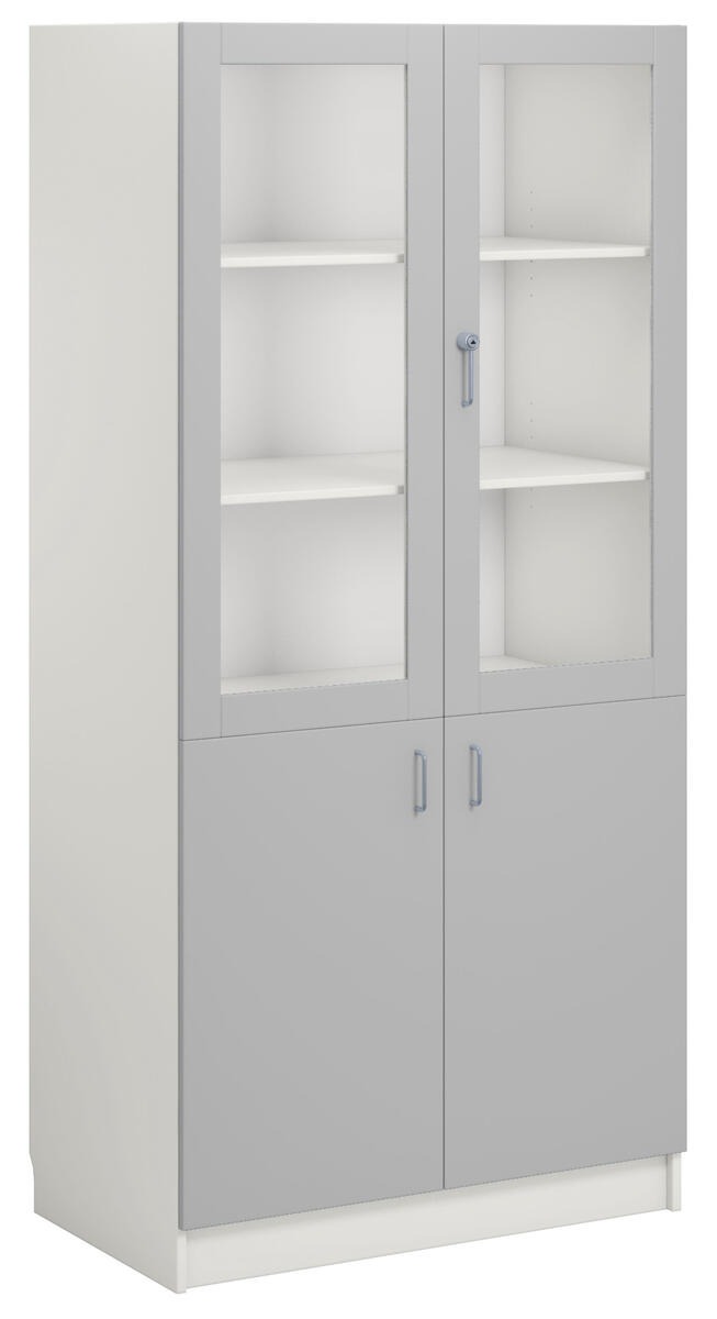 Materialeskab med korpus i decor laminat. Fronter i decor laminat eller højtrykslaminat. Indeholder 5 hylder, hvoraf 3 er flytbare. 2 låger i hærdet glas med cylinderlås (inkl. 2 nøgler) og 2 lukkede låger med greb. Lågerne kan åbnes i en vinkel på 170°.