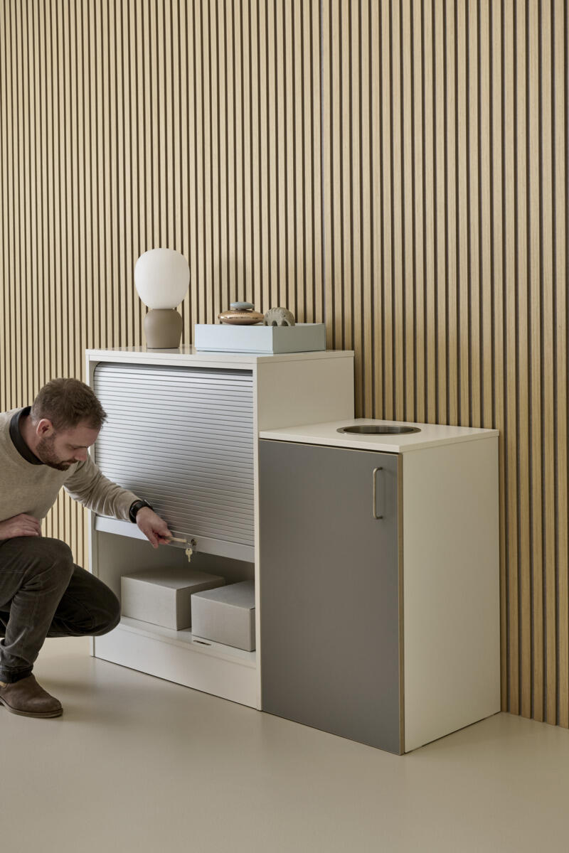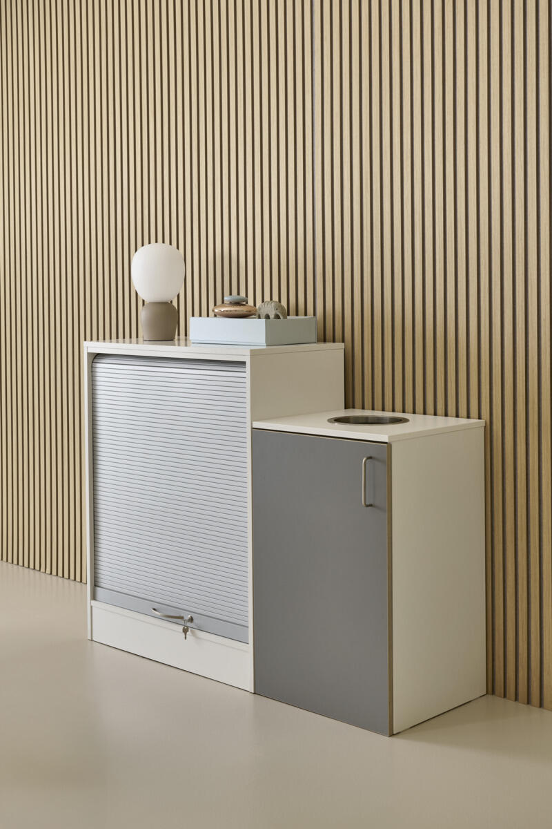 Mål: 80x42x101 cm. Gråt korpus i melamin. Jalousi i melaminbelagt spånplade. 2 hylder. Kan låses (inkl. 2 nøgler).