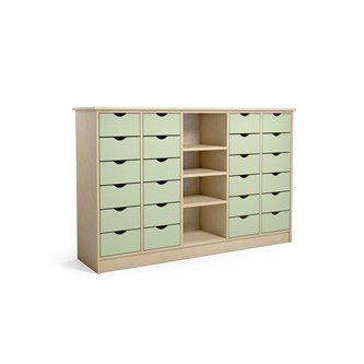 Købmandsdisk/kommode med 24 store skuffer på udtræksskinner og sokkel. Korpus i 18 mm klarlakeret birkekrydsfinér. Kan bruges som rumdeler. Skuffens indvendige mål: B30xD32xH9,5 cm. Mål: 150x37x98 cm. Vælg mellem forskellige farver på skuffefronterne, når du vælger variant nedenfor. Leveres med vinkelbeslag for fastgørelse til væggen.