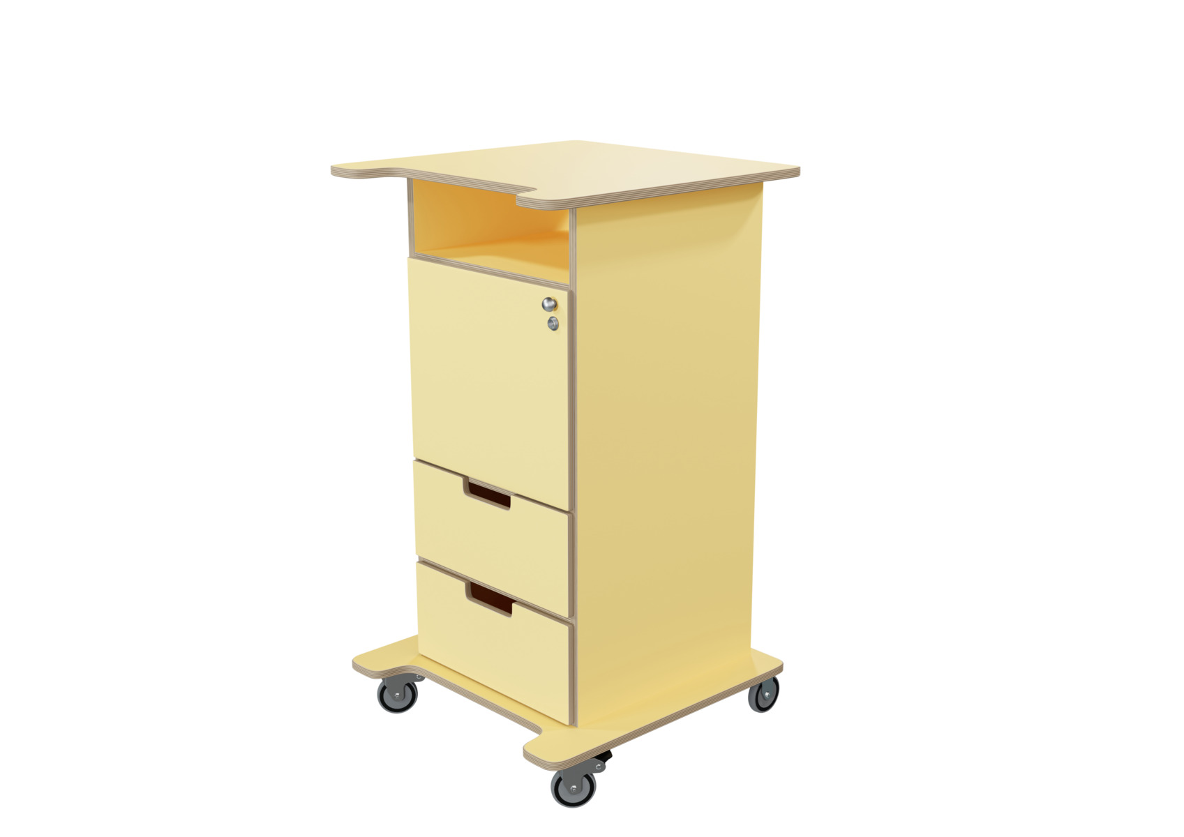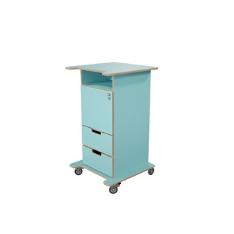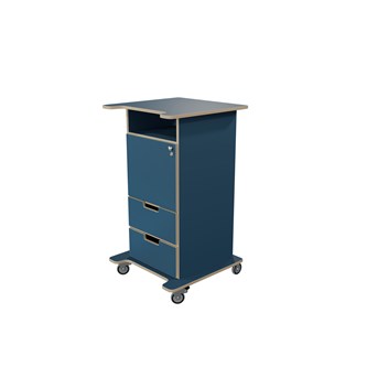 Pult med åbent rum, låsbar låge samt to skuffer. To nøgler medfølger. Fire hjul, hvoraf to er drejelige og låsbare og to er faste, kræver enkel montering. Fremstillet i 16 mm birkekrydsfiner. Farver med "HT" er med højtrykslaminat. Birk og hvidpigmenteret er i 18 mm krydsfiner. Pult mål: B45xD46xH100 cm. Samlet mål: B60xD61xH107 cm.