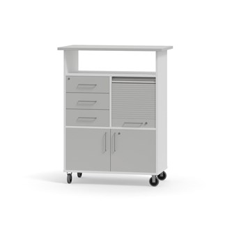 Hvidt korpus, vælg farve på front og topplade. 2 faste hjul og 2 drejelige hjul, lås på alle fire hjul. Hjulhøjde 12 cm inkl. beslag. 2 nøgler hver til skuffe, jalousi og låge, i alt 6 nøgler. Håndtag på skuffer, jalousi og låger. Mål mellem møblet og toppladen: 18 cm. Mål på toppladen: 85x50 cm, tykkelse 25 mm. Skuffer med stop foran, ikke soft close. Indvendige mål øverste skuffe: B34xD34,5xH4 cm. Andre skuffer samme mål, men H7 cm. Spånplade med melamin, tykkelse 18 mm. Front- og toppanel i højtrykslaminat.
