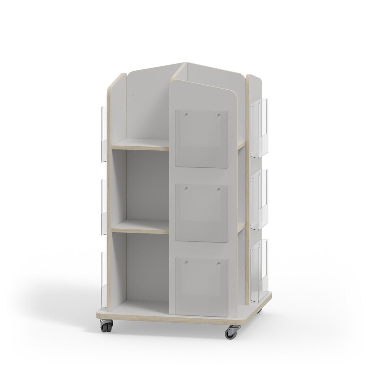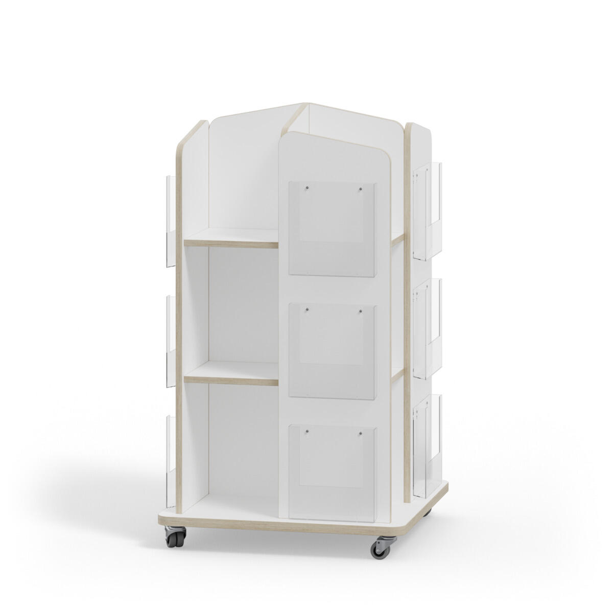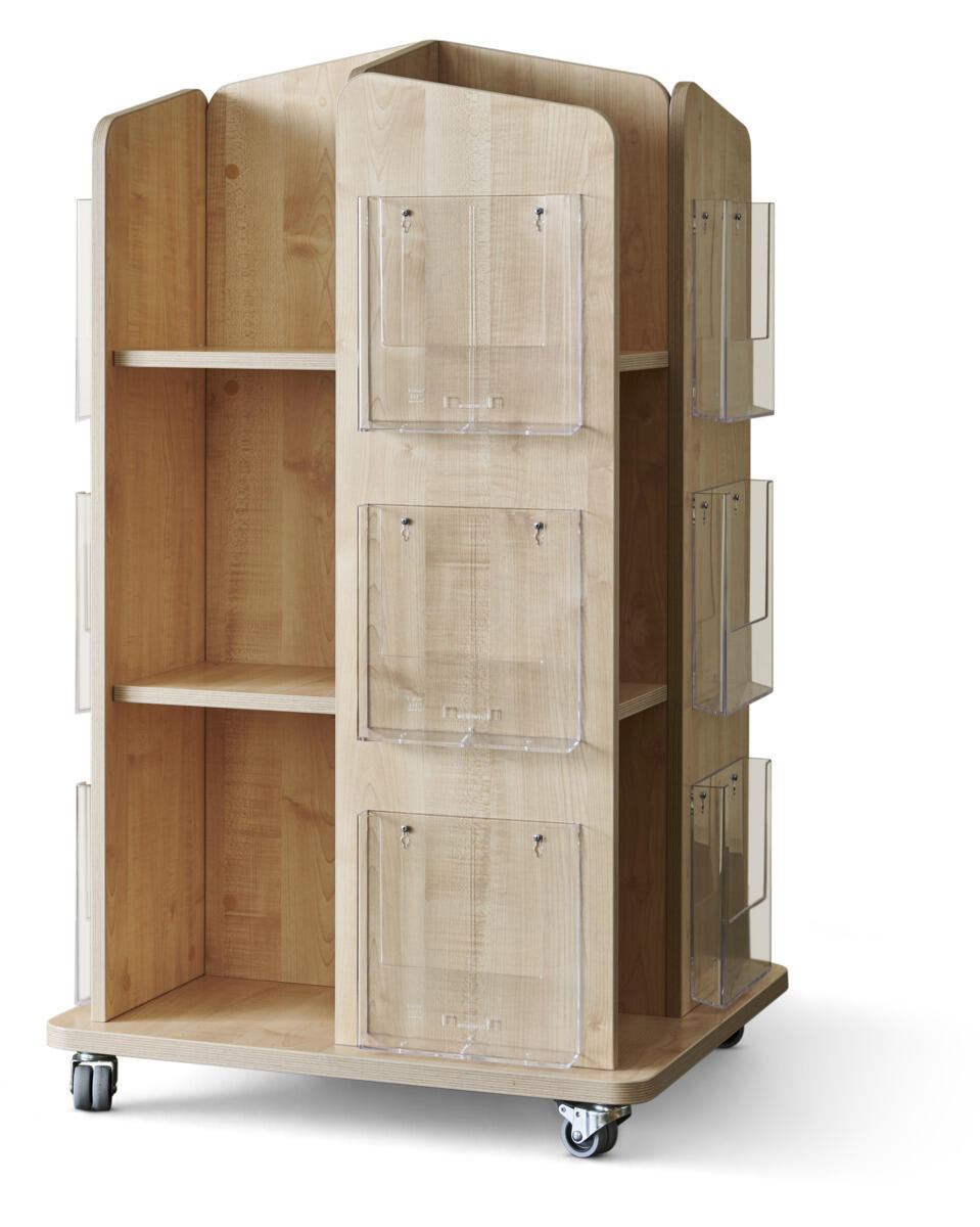 Bogvogn med 4 bevægelige dobbelthjul, hvoraf 2 er låsbare. Monterede ved levering. Alle fire sider har 3 plastiklommer til display i A4-format og 3 hylder. Fremstillet af 18 mm spånplade med laminat. Kantbånd i krydsfinérlook. Mål: H120x60x60 cm. Bundplade 69x69 cm. Hylder 27x27 cm. Højde mellem hylder 35 cm. Fra gulv til bundpladens overkant 10 cm.