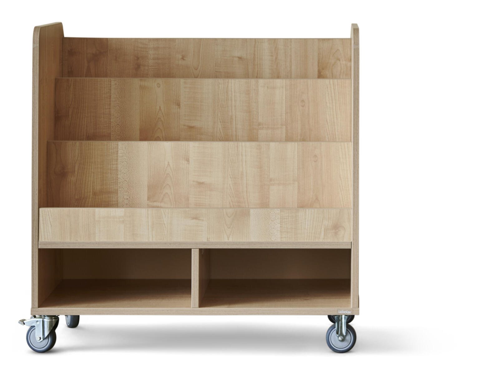 Enkelt-sidet bogvogn fremstillet i 18 mm spånplade med laminat. Kantliste i krydsfinerlook. Fire hjul, hvoraf to er låsbare og bevægelige, og to er faste. Totalhøjde 80 cm. Højde på forkant af hylde: 8 cm. Højde på bagkant af de to forreste hylder: 23 cm. Øverste bagkant er 18 cm. Dybde på hver hylde: 12 cm. Rummål nederst: 14,5 cm højde, 37 cm bredde. Dybde: 40,5 cm.