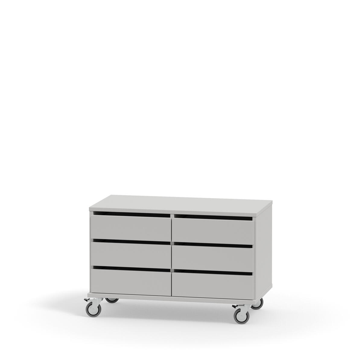 Svea elevopbevaring på hjul med 6 skuffer og close-funktion for lydsløs og skånsom lukning. Leveres færdigsamlet med bundplade som er lidt bredere for øget stabilitet. 4 hjul, hvoraf to er bevægelige og med lås på den ene kortside. De to andre er faste, hvilket gør opbevaringen stabil ved flytning. Skuffer med smal åbning, der fungerer som postkasse og håndtag til åbning. Materiale 18 mm spånplade med laminat. ABS kant. B80 D40 H52 cm. Skuffens indermål: B34xD33,5xH7 cm.