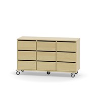Svea elevopbevaring på hjul med 9 skuffer og 3 rum. Leveres færdigsamlet med bundplade som er lidt bredere for øget stabilitet. 5 hjul, hvoraf to er bevægelige og med lås på den ene kortside. De to andre er faste, hvilket gør opbevaringen stabil ved flytning. Skuffer med smal åbning, der fungerer som postkasse og håndtag til åbning.Soft close-funktion for lydsløs og skånsom lukning. Materiale 18 mm spånplade med laminat. ABS kant. B120 D40 H90 cm. Skuffens indermål: B34xD33,5xH7 cm.