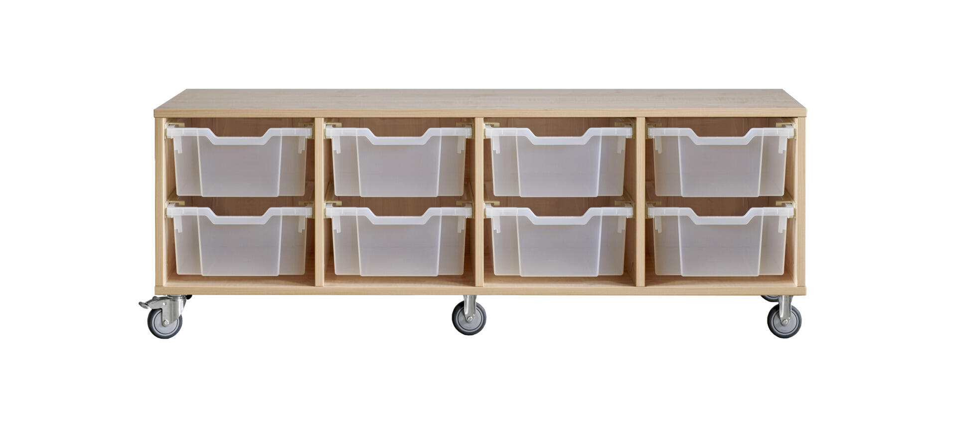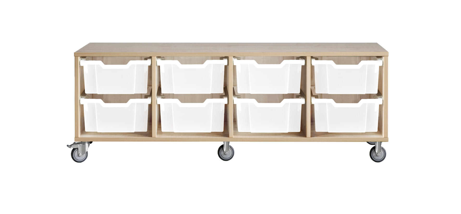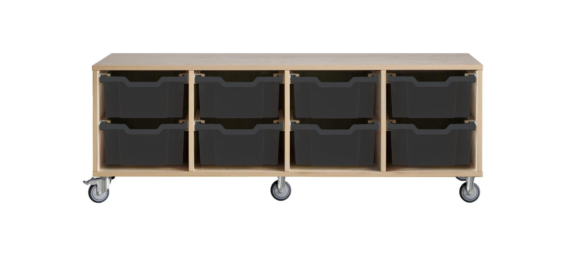 Komplet opbevaringsreol med bakker fra Gratnells. Ved valg af hjul: 6 hjul, hvoraf 2 er faste, gør det opbevaringen stabil ved flytning. De drejbare er med bremse. Materiale 18 mm spånplade med laminat og ABS-kantbånd. Stel med ben og sokkel skal fastgøres til væggen med medfølgende vægbeslag. Skruer til dette er ikke inkluderet. Skinne med stop til bakke. Mål på bakke: B31,2xD42,7xH15 cm. Vælg farve på bakke.