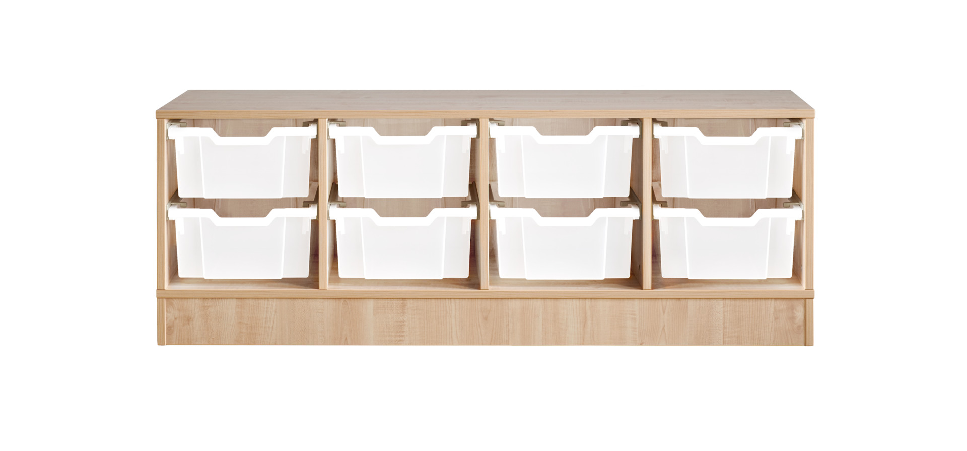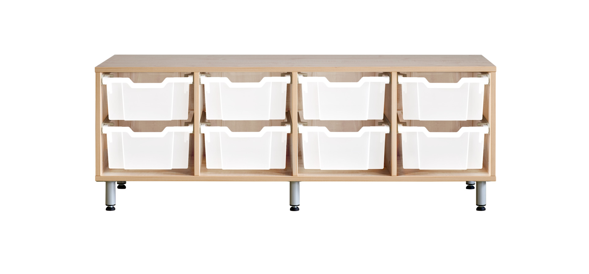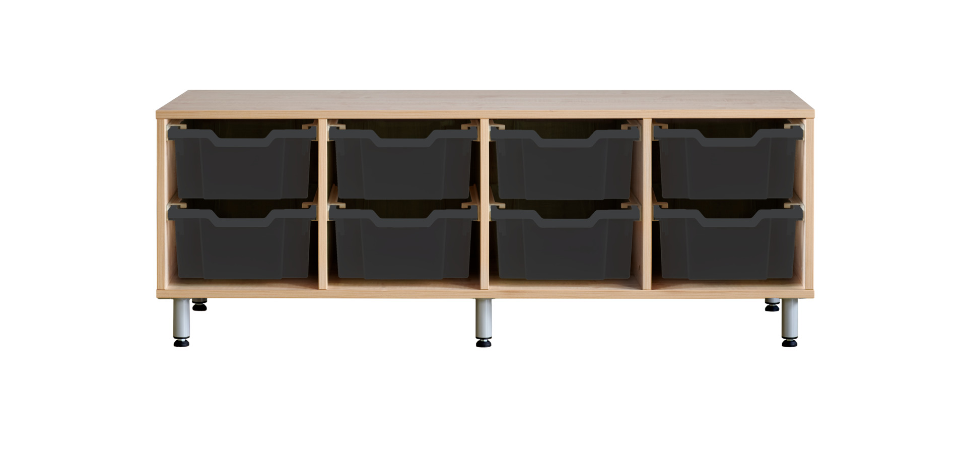 Komplet opbevaringsreol med bakker fra Gratnells. Ved valg af hjul: 4 hjul, hvoraf 2 er faste, gør det opbevaringen stabil ved flytning. De drejbare er med bremse. Materiale 18 mm spånplade med laminat og ABS-kantbånd. Stel med ben og sokkel skal fastgøres til væggen med medfølgende vægbeslag. Skruer til dette er ikke inkluderet. Skinne med stop til bakke. Mål på bakke: B31,2xD42,7xH7,5 cm. Vælg farve på bakke.