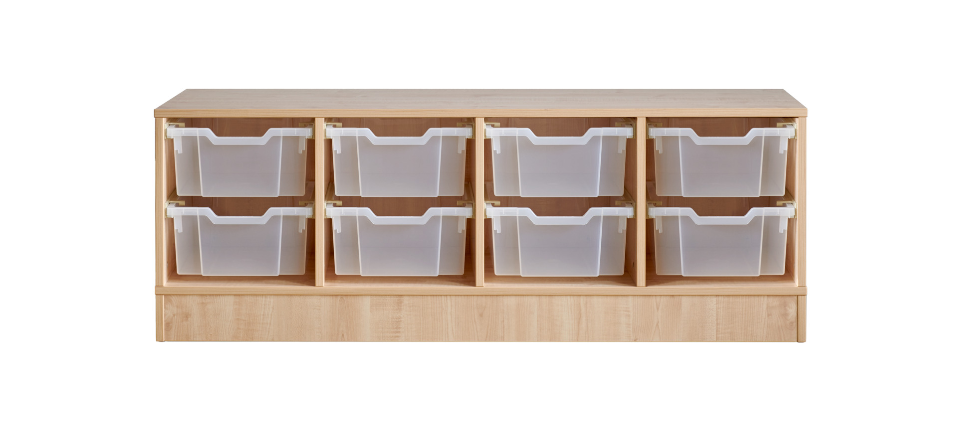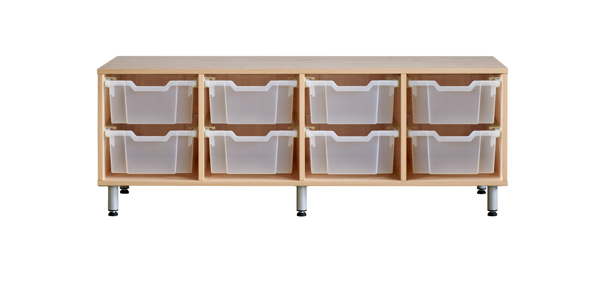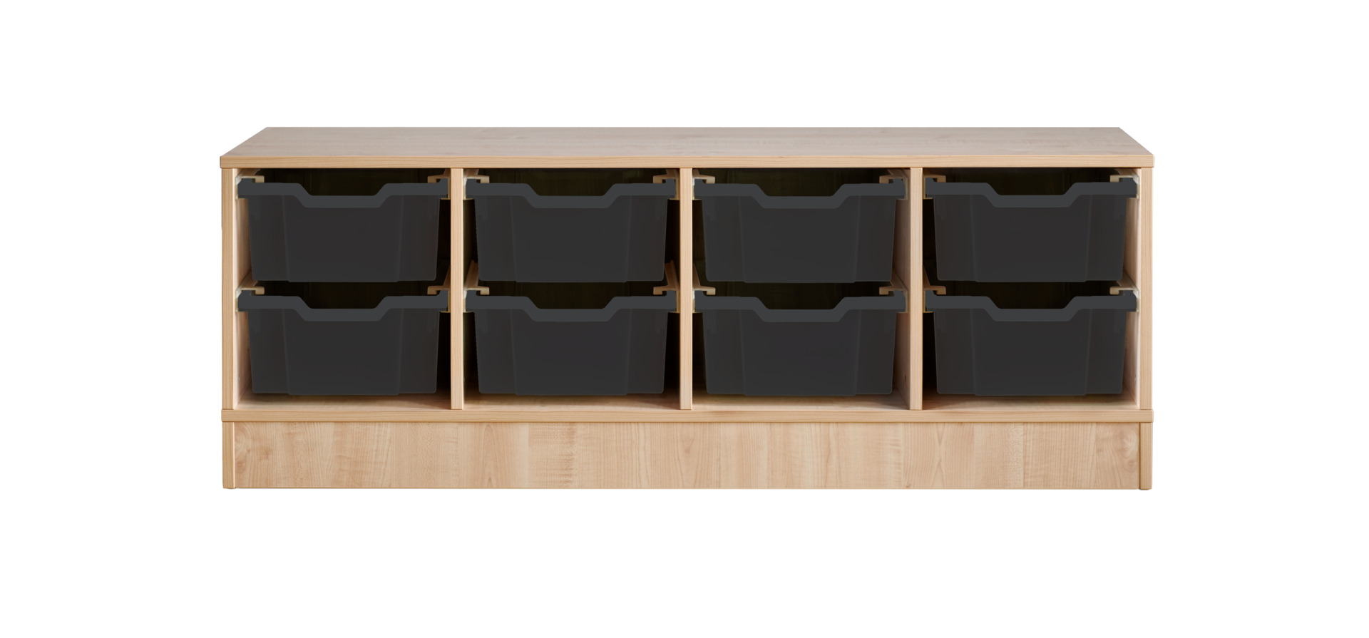 Komplet opbevaringsreol med bakker fra Gratnells. Ved valg af hjul: 4 hjul, hvoraf 2 er faste, gør det opbevaringen stabil ved flytning. De drejbare er med bremse. Materiale 18 mm spånplade med laminat og ABS-kantbånd. Stel med ben og sokkel skal fastgøres til væggen med medfølgende vægbeslag. Skruer til dette er ikke inkluderet. Skinne med stop til bakke. Mål på bakke: B31,2xD42,7xH7,5 cm. Vælg farve på bakke.