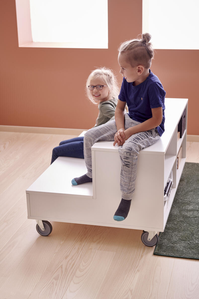 Svea legebord har 4 rum til opbevaring. 4 roterbare hjul, hvoraf 2 er låsbare. Hele serien er lavet af FSC-certificeret melamin. Materiale 18 mm spånplade med melamin. Hjulene er 12 cm høje. Mål: B80 D80 H42 cm. Højden inkluderer hjul. Rummets mål: B37 D39 H19 cm.
