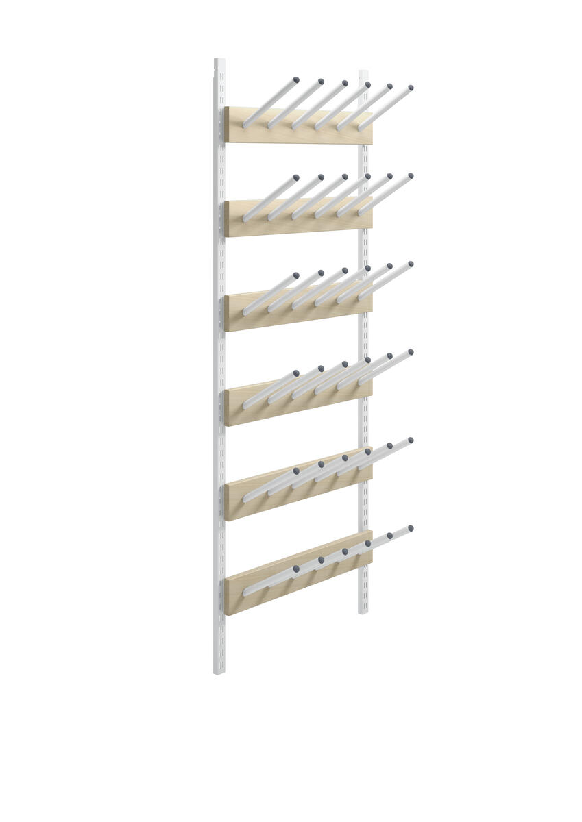 Komplet støvlevæg fra Wille skinnesystem. En enkel kombination som nemt kan udvides med vores tilbehør til præcis den kombination som ønskes. Består af 6 støvlerækker med plads til 18 par støvler. Bredde 60 cm.