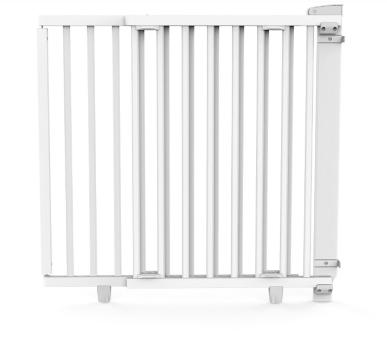 Foldbart børnegitter uden tærskel, som kan monteres på både venstre- og højrehængte døre. Foldes automatisk tilbage, når det ikke er i brug. Bredden kan justeres mellem 55-89 cm. Højde 74 cm.