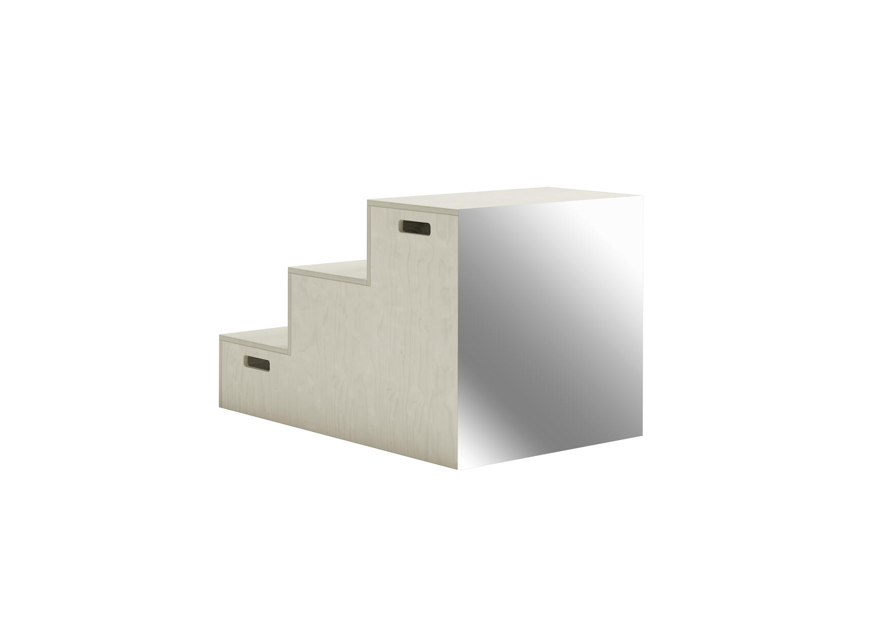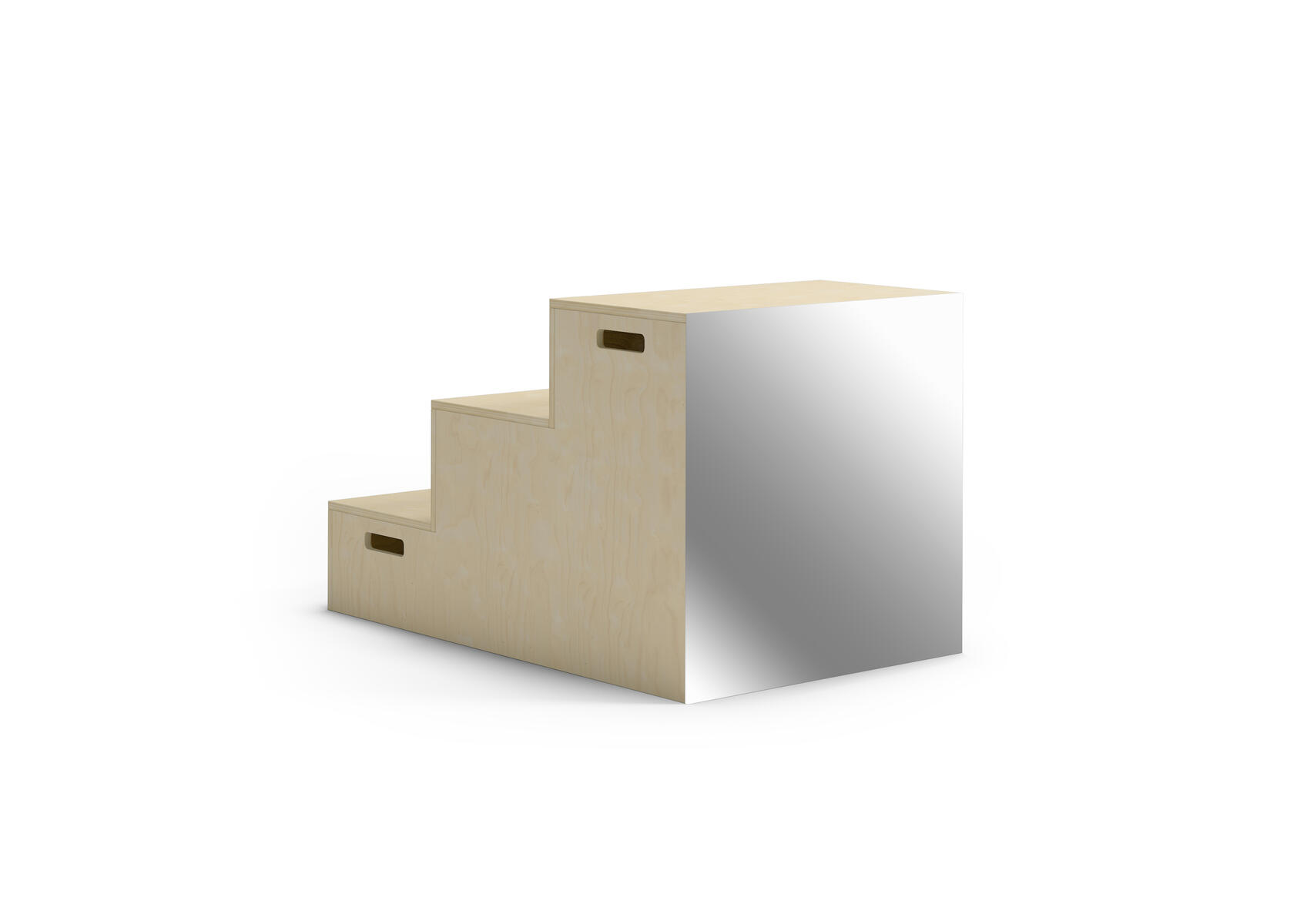 Tribunemodul til de små børn. Med 3 trin. Af FSC-certificeret birkekrydsfinér. Mål: 60x99x59,5 cm. Spejl af laminat på bagsiden. Svanemærket, licensnummer 5031 0099.