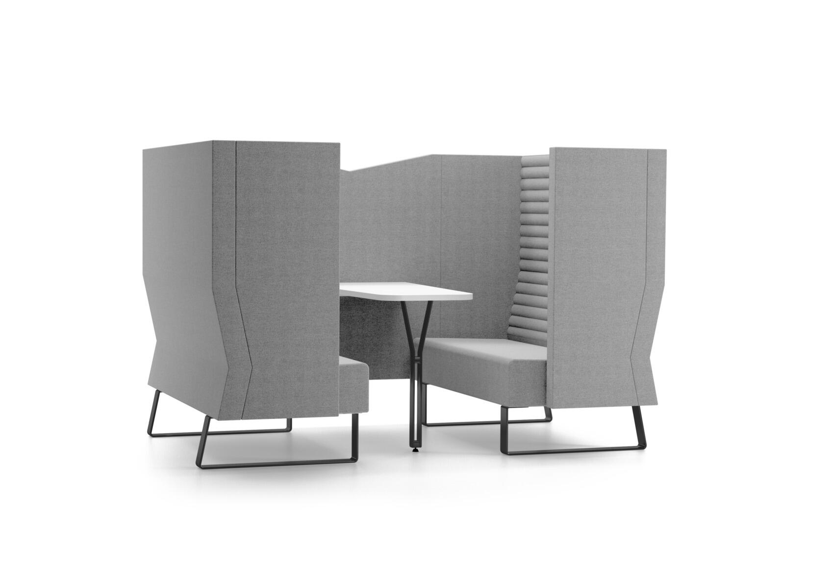 Omfavnende sofa, som takket være sine høje sider har en lyddæmpende og afskærmende effekt, hvilket gør den velegnet til fx gruppemøder, samarbejdsopgaver eller alenetid i et afdæmpet miljø. De høje sider skaber afskærmning fra resten af rummet og dæmper ikke kun lyd udefra, men også indefra og ud. Inkl. bord med hvid laminatplade 120x60/40 cm. Træramme og polstring i koldskum. Meder i pulverlakeret metal. Farvevalg på ryg og midtervæg. Gavle og sæde er altid i grå nuance i det valgte stof. Som tilvalg fås strømudtag i bordpladen.