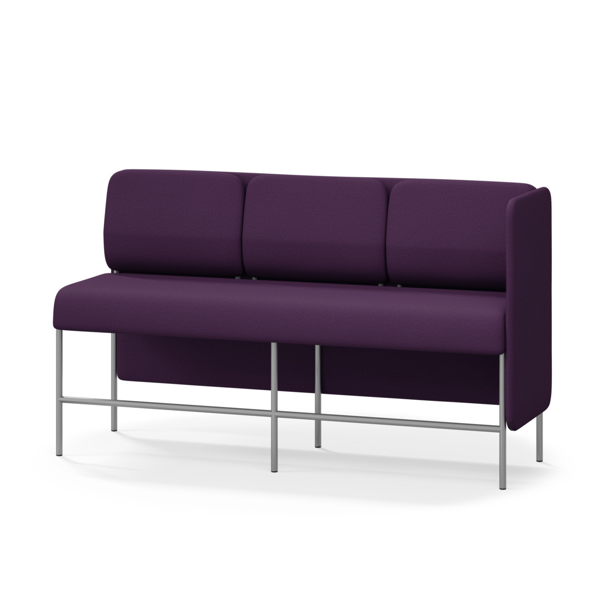 3-pers. sofa-modul med ergonomisk formet ryghynde og lydabsorberende panel. Sofasystemet er designet til at skabe pladsbesparende løsninger, der fremmer studie-ro, tryghed, fællesskab og inklusion i skolen. Vi har reduceret materialeforbruget og udviklet et cirkulært produkt, hvor alle dele kan udskiftes. Sofaen har en praktisk krumme-sprække og et højt metalstel, der letter rengøring. Hynder og paneler har aftageligt betræk for nem vedligeholdelse. Rammen er fremstillet af krydsfiner med koldskumspolstring, mens stellet i pulverlakeret metal med justerbare fødder sikrer stabilitet – også på ujævne underlag. Design: Sigrid Strömgren.