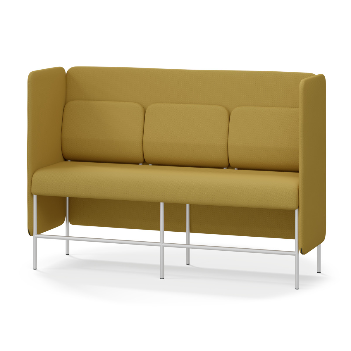 3-pers. sofa-modul med ergonomisk formet ryghynde og lydabsorberende panel. Sofasystemet er designet til at skabe pladsbesparende løsninger, der fremmer studie-ro, tryghed, fællesskab og inklusion i skolen. Vi har reduceret materialeforbruget og udviklet et cirkulært produkt, hvor alle dele kan udskiftes. Sofaen har en praktisk krumme-sprække og et højt metalstel, der letter rengøring. Hynder og paneler har aftageligt betræk for nem vedligeholdelse. Rammen er fremstillet af krydsfiner med koldskumspolstring, mens stellet i pulverlakeret metal med justerbare fødder sikrer stabilitet – også på ujævne underlag. Design: Sigrid Strömgren.