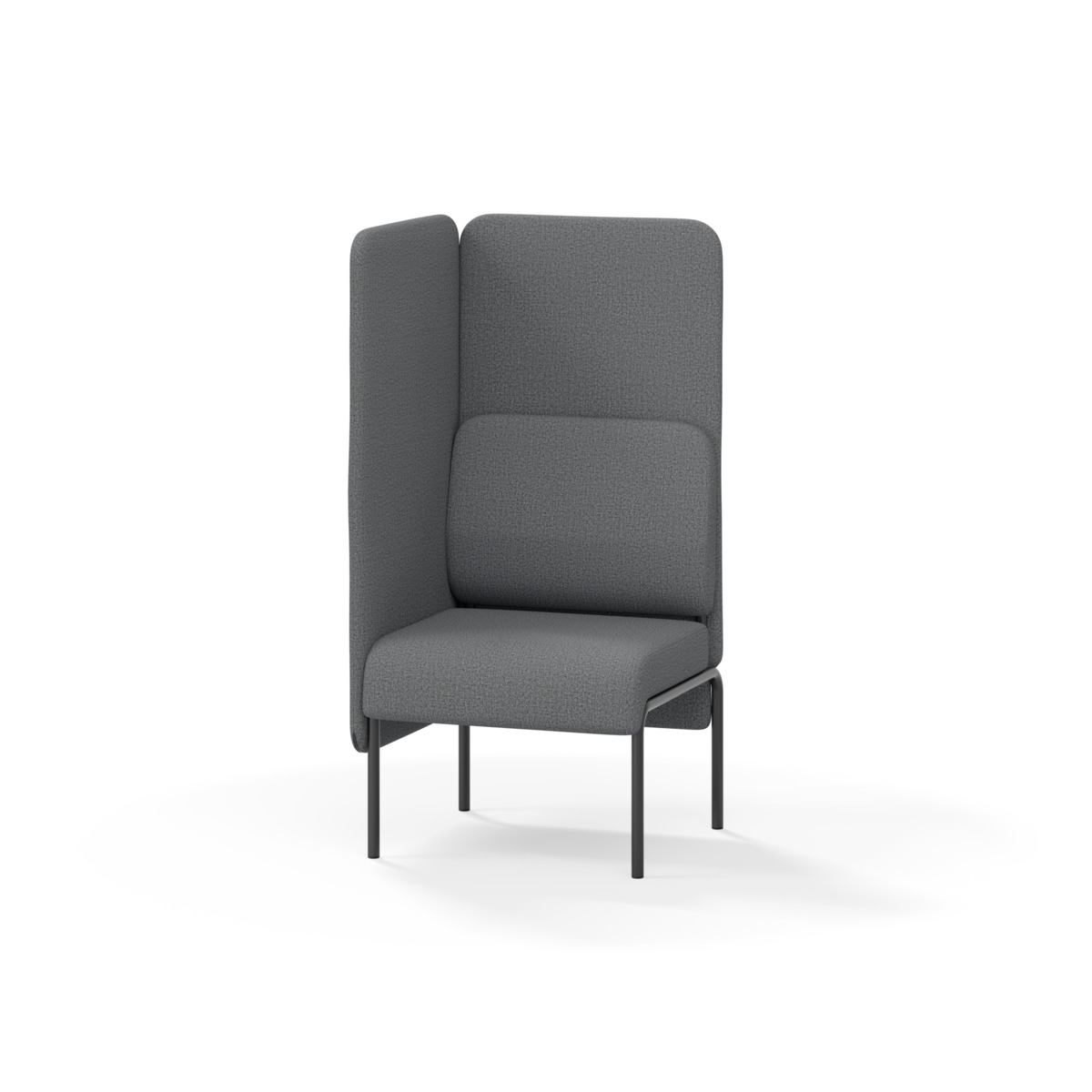 1-pers. sofa-modul med ergonomisk formet ryghynde og lydabsorberende panel. Sofasystemet er designet til at skabe pladsbesparende løsninger, der fremmer studie-ro, tryghed, fællesskab og inklusion i skolen. Vi har reduceret materialeforbruget og udviklet et cirkulært produkt, hvor alle dele kan udskiftes. Sofaen har en praktisk krumme-sprække og et højt metalstel, der letter rengøring. Hynder og paneler har aftageligt betræk for nem vedligeholdelse. Rammen er fremstillet af krydsfiner med koldskumspolstring, mens stellet i pulverlakeret metal med justerbare fødder sikrer stabilitet – også på ujævne underlag. Design: Sigrid Strömgren.