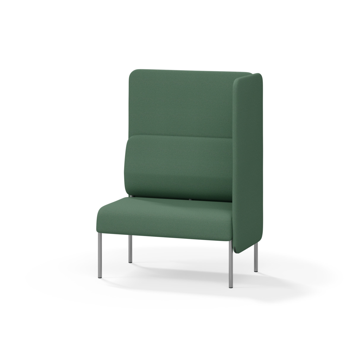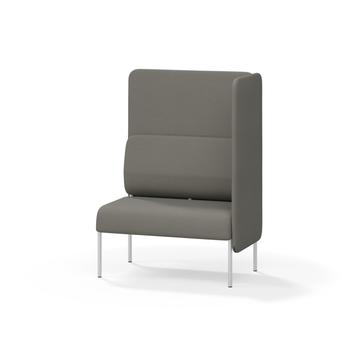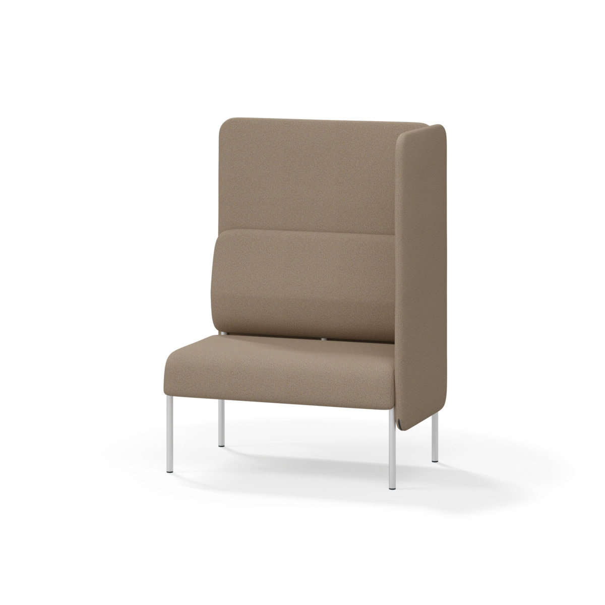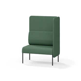 1-pers. sofa-modul med ergonomisk formet ryghynde og lydabsorberende panel. Sofasystemet er designet til at skabe pladsbesparende løsninger, der fremmer studie-ro, tryghed, fællesskab og inklusion i skolen. Vi har reduceret materialeforbruget og udviklet et cirkulært produkt, hvor alle dele kan udskiftes. Sofaen har en praktisk krumme-sprække og et højt metalstel, der letter rengøring. Hynder og paneler har aftageligt betræk for nem vedligeholdelse. Rammen er fremstillet af krydsfiner med koldskumspolstring, mens stellet i pulverlakeret metal med justerbare fødder sikrer stabilitet – også på ujævne underlag. Design: Sigrid Strömgren.